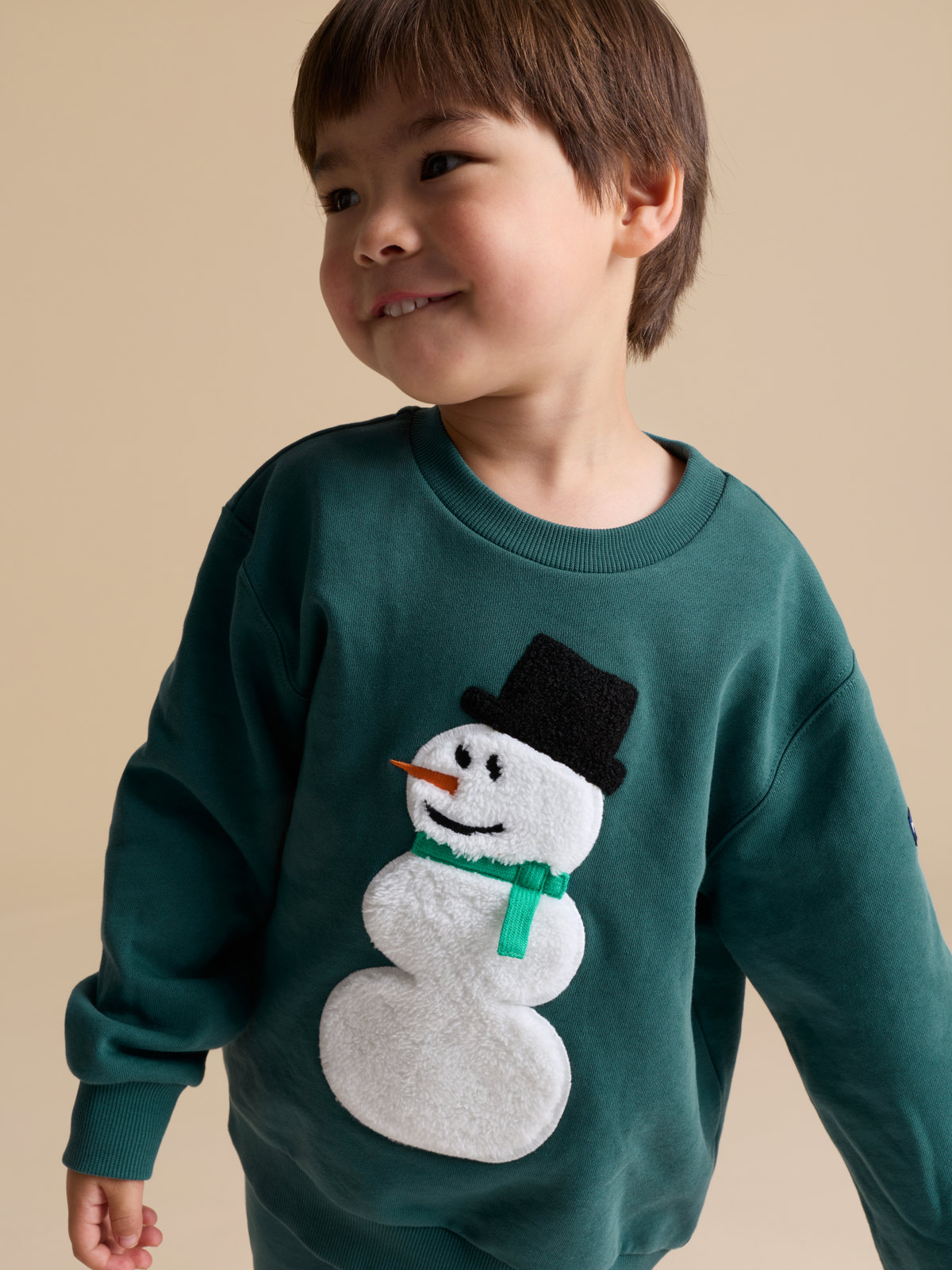 Pullover aus 100 % Bio-Baumwolle in weicher Sweatqualität.Das Sweatshirt hat ein großes, schönes Stickerei-Motiv in Form eines Schneemanns auf der Vorderseite weiche Bündchen an Halsausschnitt, Ärmeln und Saum für eine bequeme Passform.