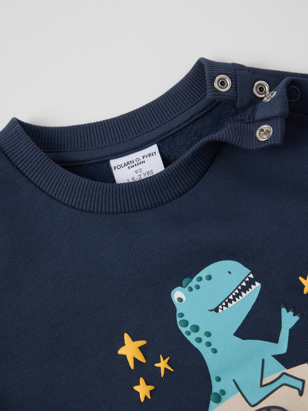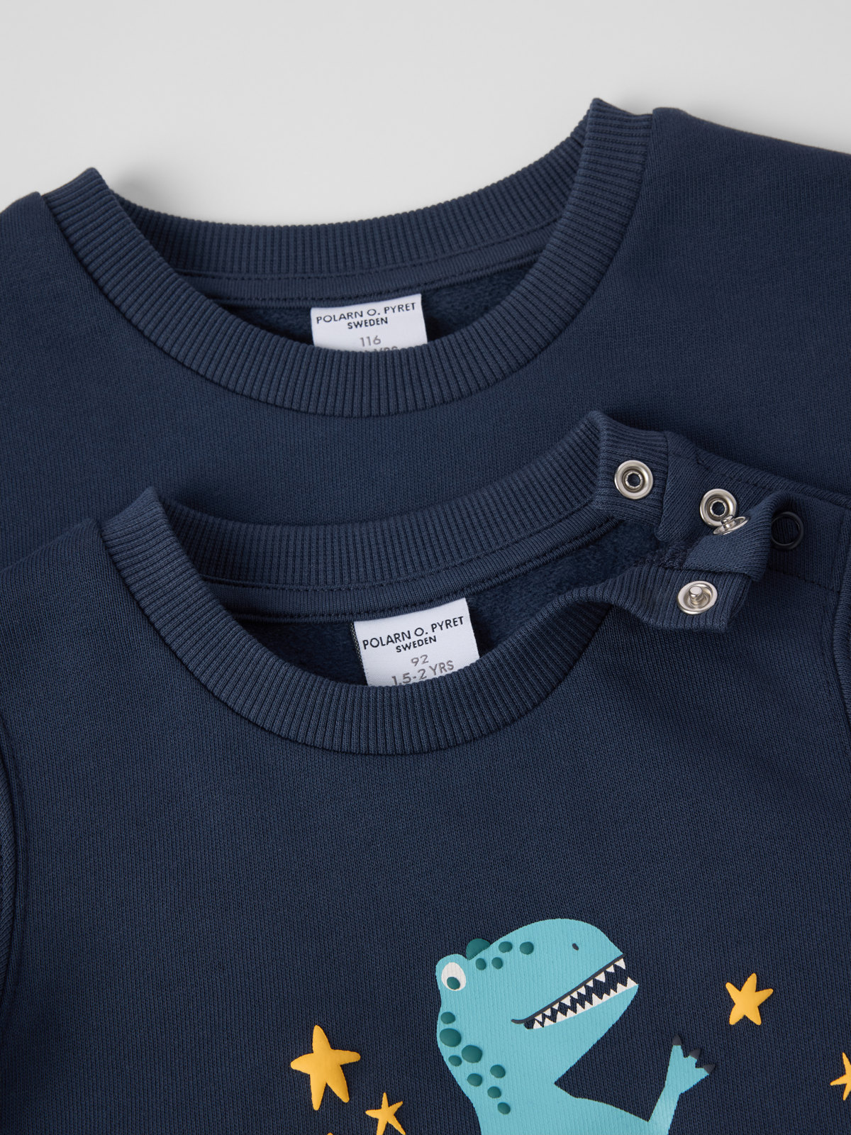 Die Größen 86 bis 92 werden hinten an einer Schulter mit Druckknöpfen geschlossen, um das An- und Ausziehen zu erleichtern.