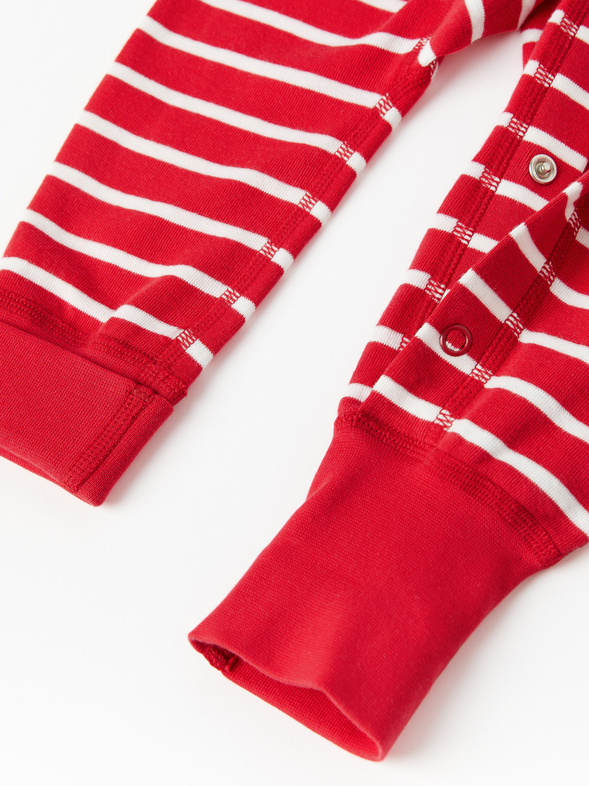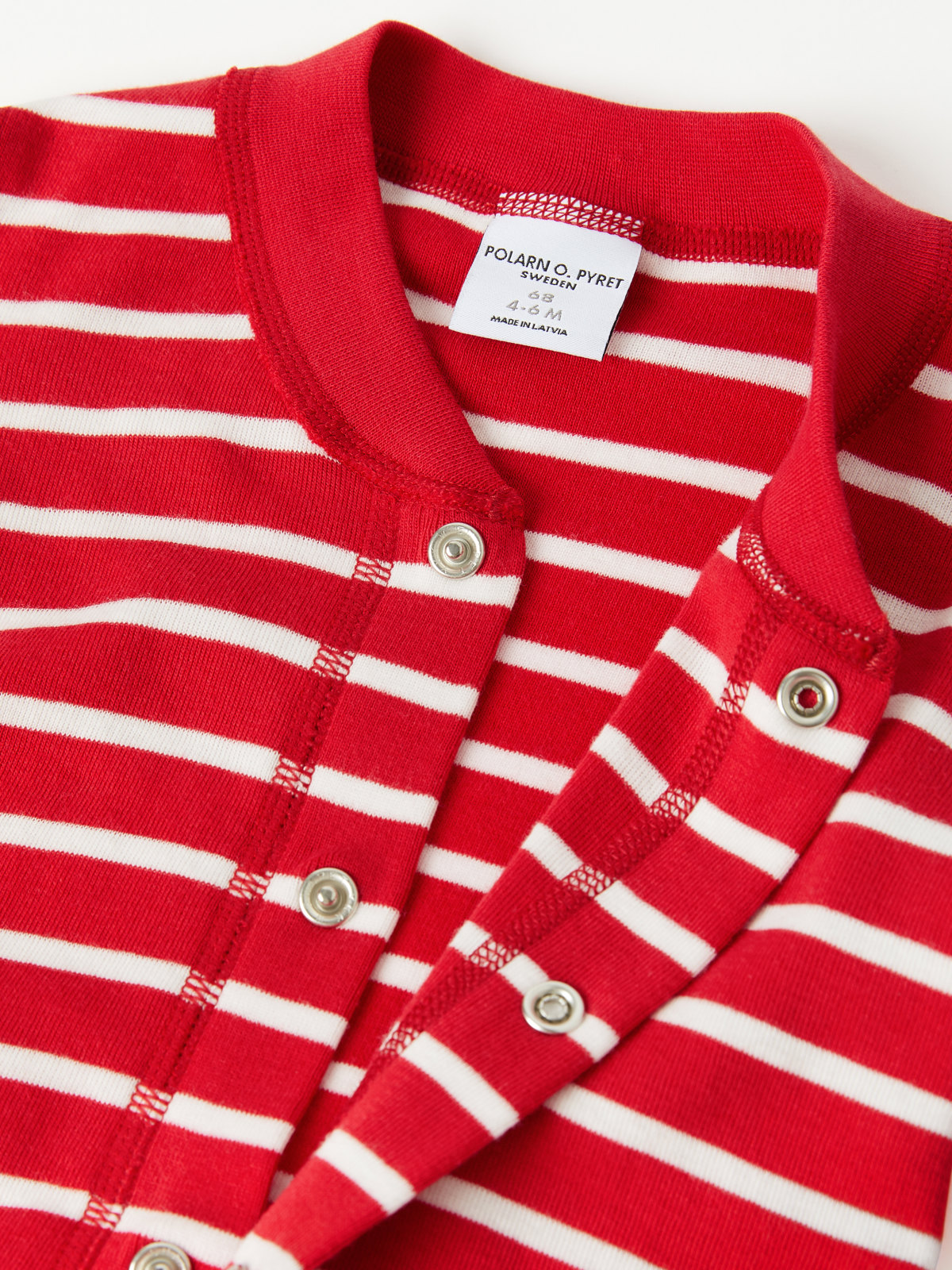 Baby-Overall aus Bio-Baumwolle mit den Polarn O. Pyret-Streifen. Die Druckknöpfe vom Halsausschnitt bis zum Beinabschluss ermöglichen leichtes An- und Ausziehen. Die Bündchen können heruntergeklappt werden, wenn dein Kind etwas größer geworden ist.