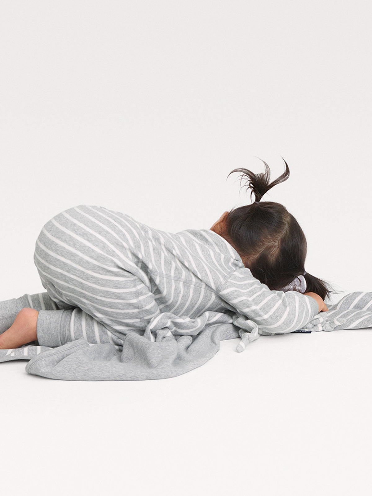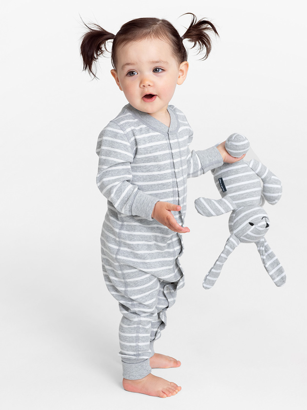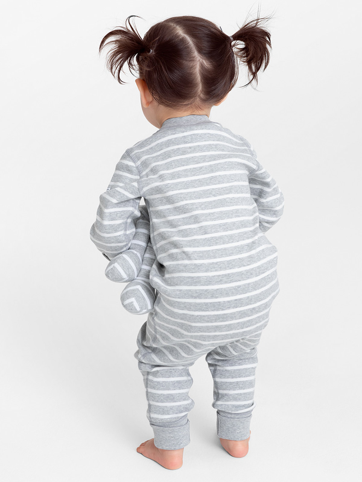 Gestreifter Baby-Overall aus weicher Bio-Baumwolle. Der Overall in unserem klassischen Streifenmuster hat Druckknöpfe vom Hals bis zum Beinabschluss, die das An- und Ausziehen erleichtern. Die extra langen Bündchen können heruntergeschlagen werden, wenn das Kind wächst.