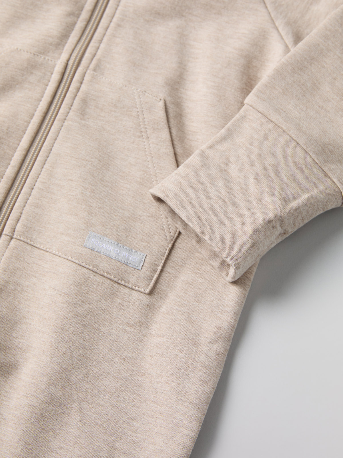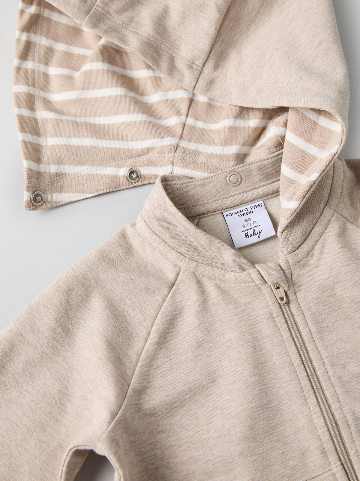 Der Overall aus weicher Bio-Baumwolle hat eine fest angesetzte Kapuze mit Trikotfutter in unseren klassischen Streifen. Der lange Reißverschluss vom Hals bis zum Beinabschluss erleichtert das An- und Ausziehen. Er ist oben mit einem Kinnschutz versehen, damit an Kinn und Wangen nichts kratzt. Der Overall hat extra lange Bündchen an Ärmel- und Beinabschlüssen zum Umschlagen, dadurch wächst er etwas mit deinem Kind mit. Vorne ist eine Kängurutasche aufgesetzt. In Größe 80 hat die Kapuze Druckknöpfe und kann abgenommen werden.