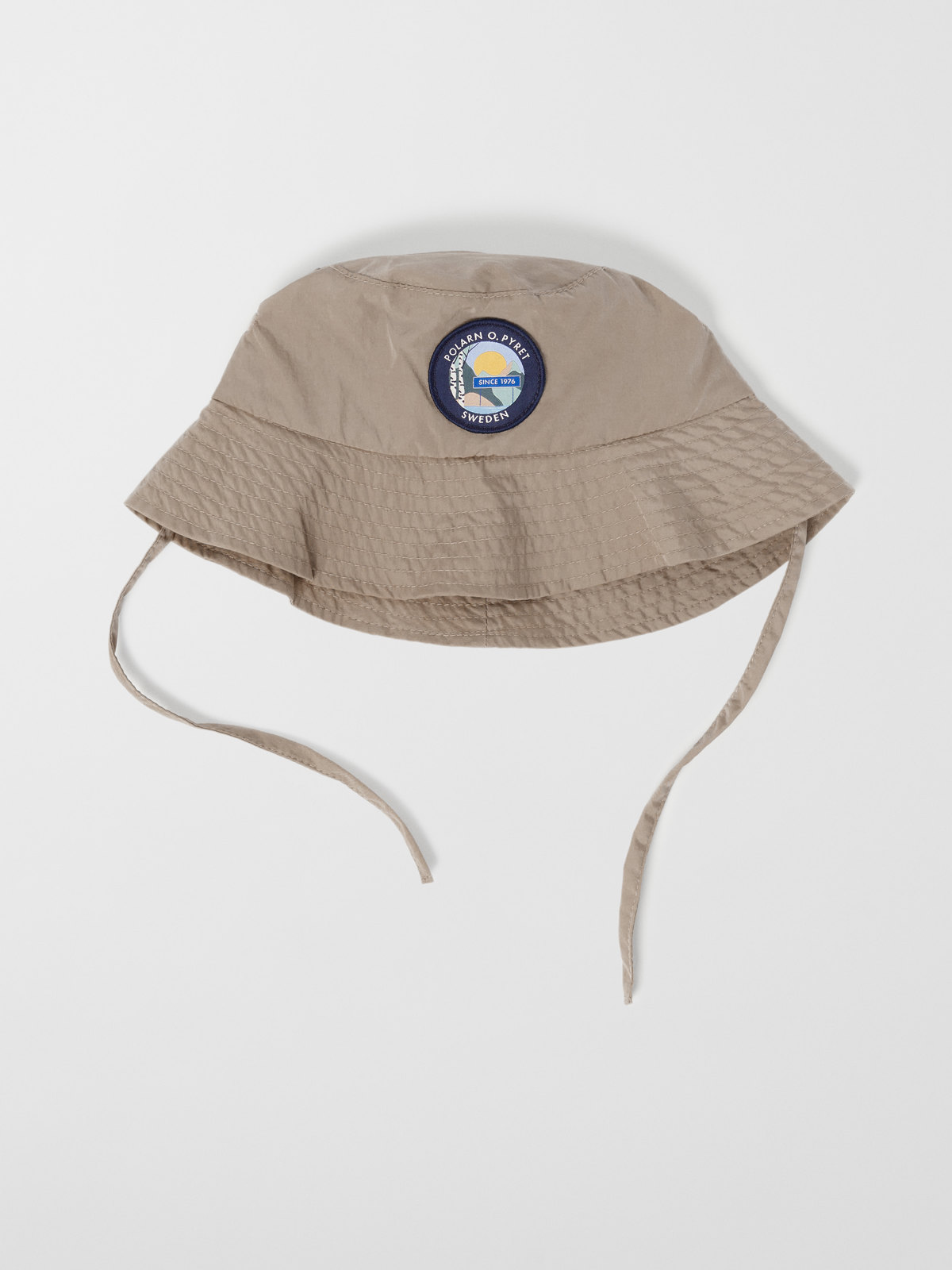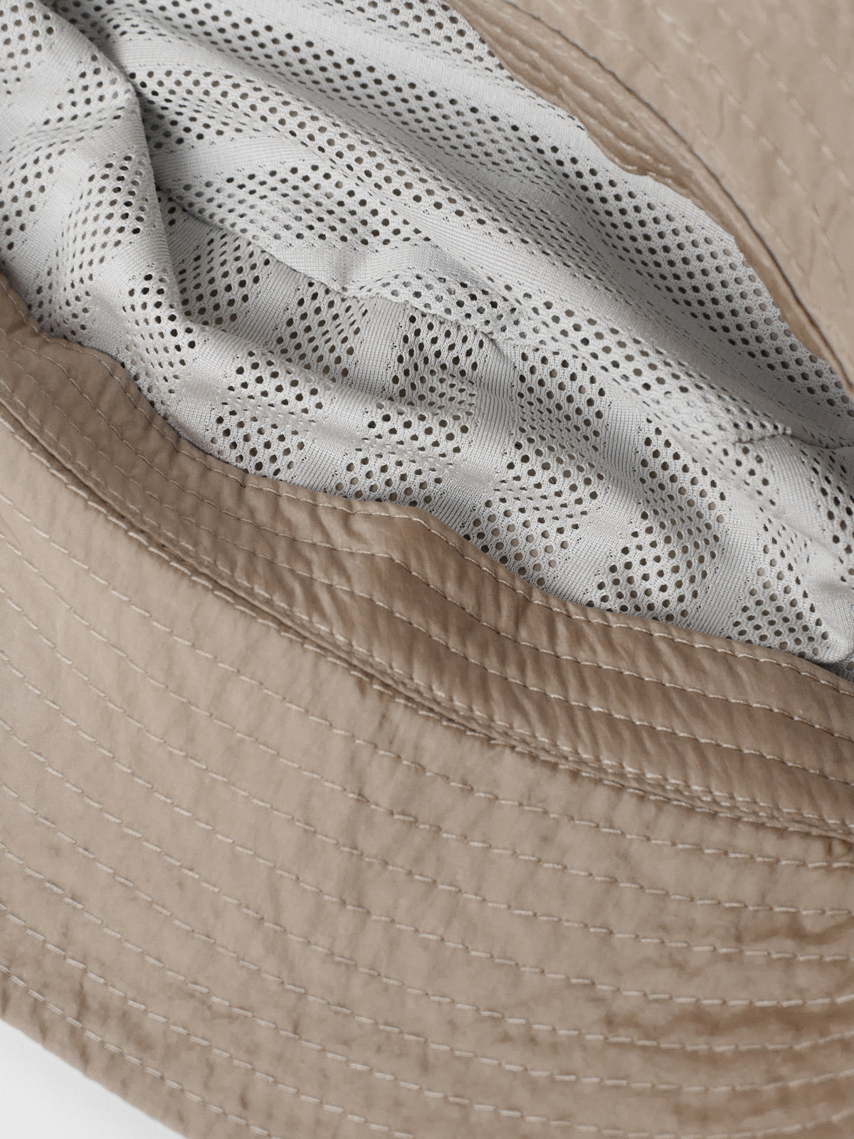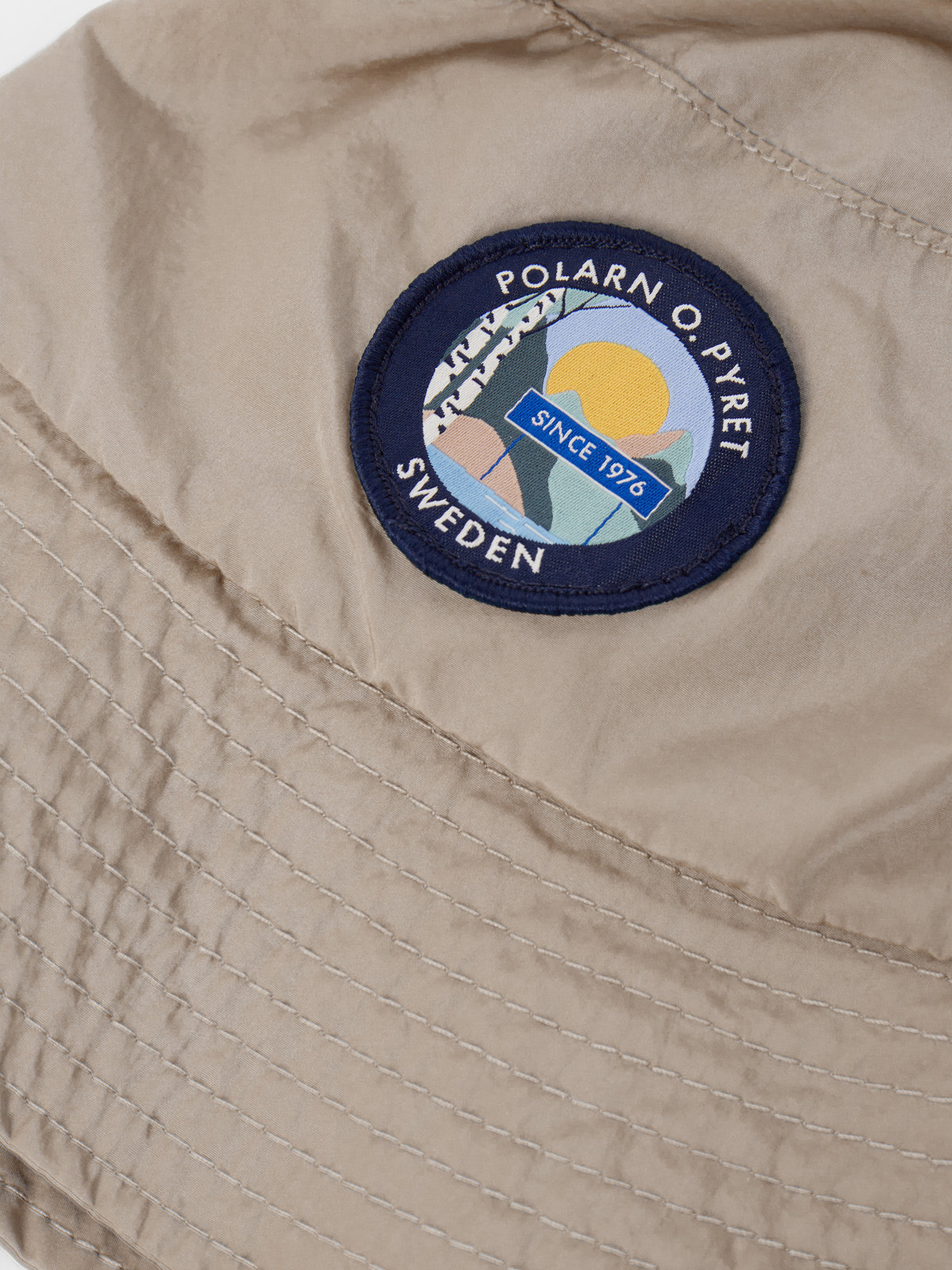 Der Hut aus recyceltem Nylon hat umstickte Löcher zur besseren Luftzirkulation und eine dekorative Applikation auf der Vorderseite.