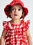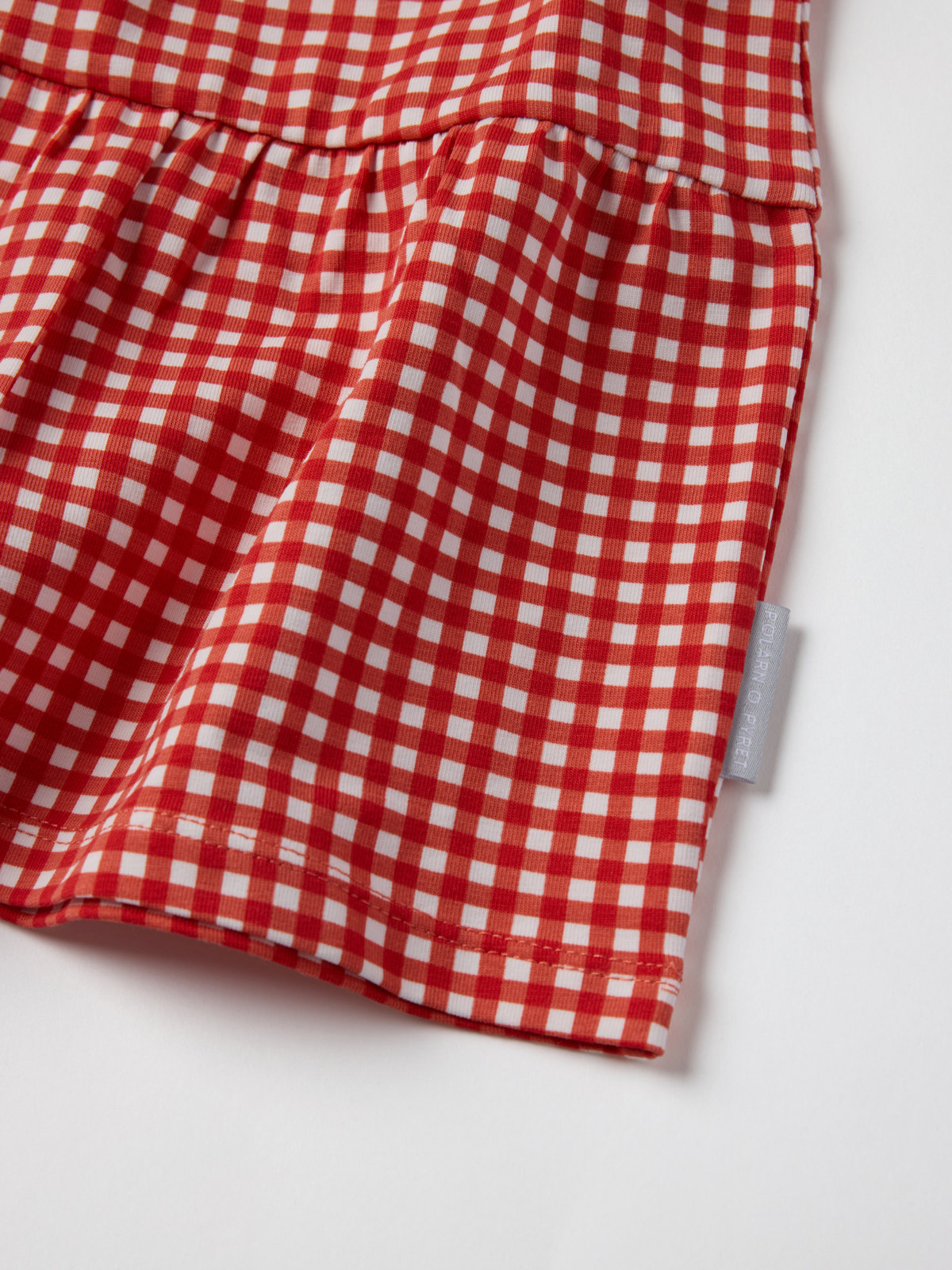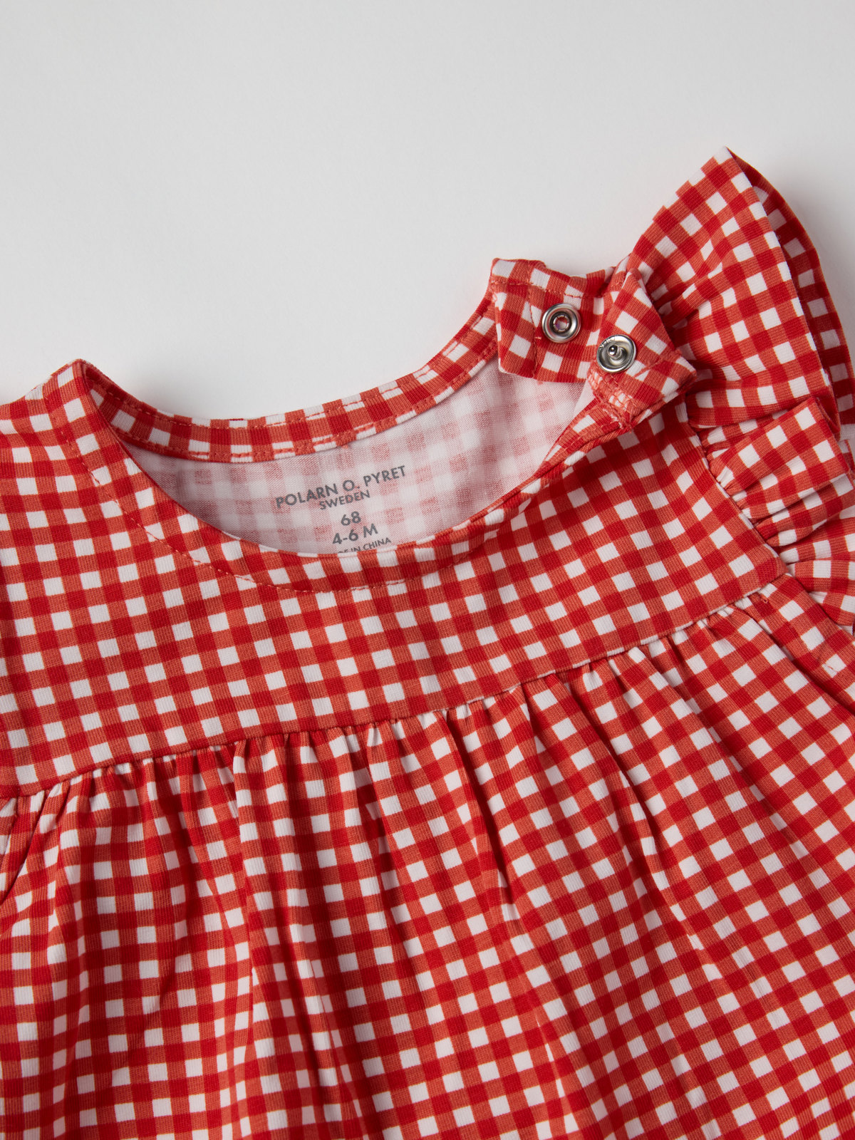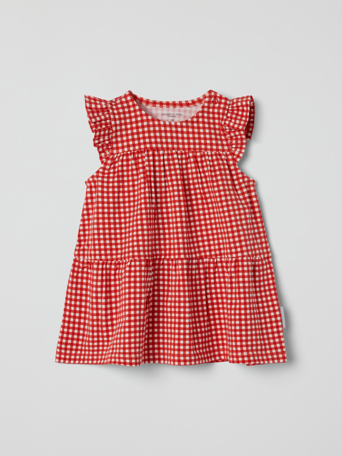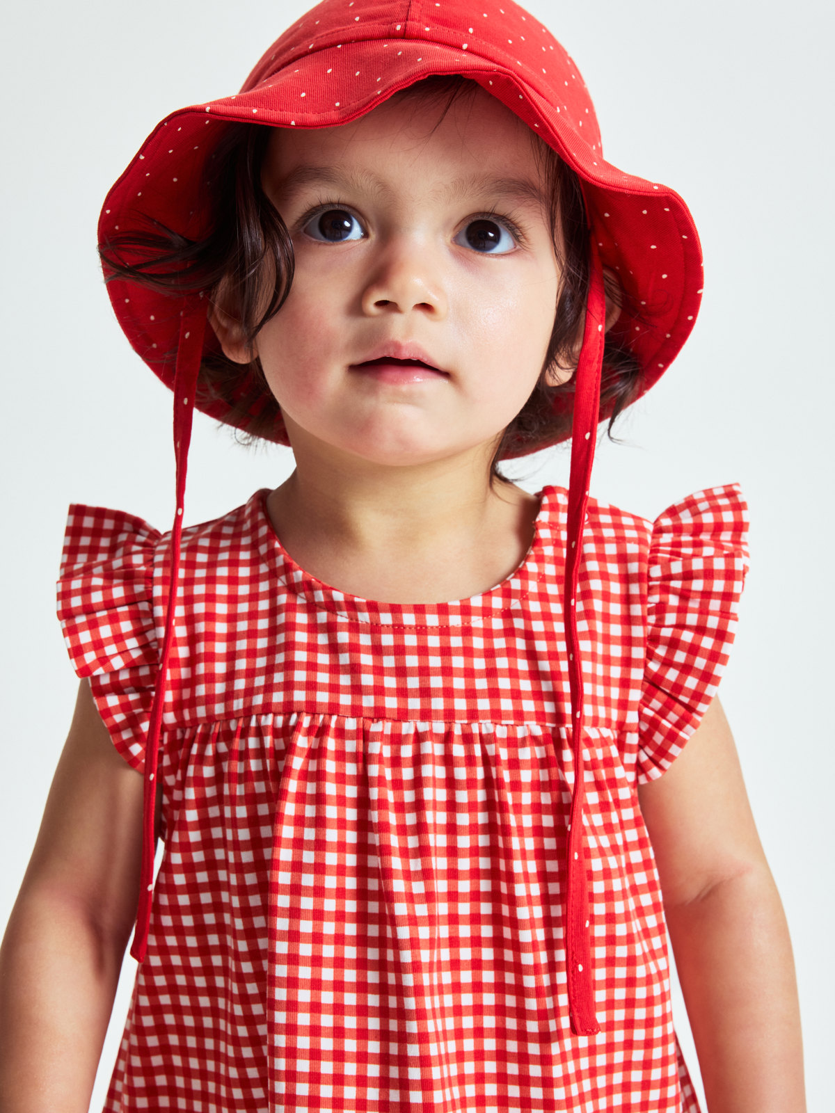 Kariertes, ärmelloses Kleid aus weichem Bio-Baumwolltrikot: ein bequemer Sommerfavorit! Das Kleid hat kleine Rüschen über den Schultern, eine lockere Passform und einen Knopfverschluss auf einer Schulter.