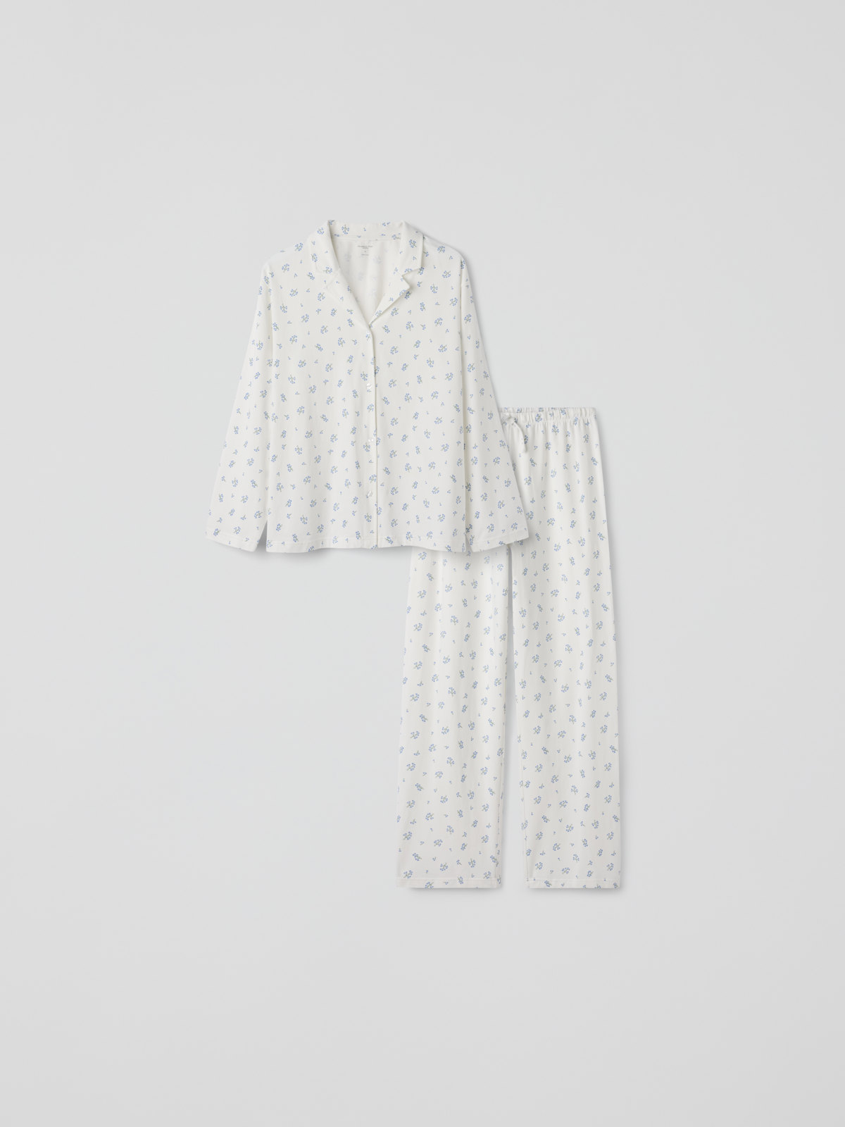 MAMA-Pyjama aus weichem Bio-Baumwolljersey – ideal zum Schlafen und Entspannen, während der Schwangerschaft und nach der Geburt. Das Oberteil hat einen weichen Kragen und eine Knopfleiste vorne. Die Hose hat gerade Beine und einen elastischen Bund, der sich angenehm unter dem wachsenden Bauch anpasst. Die Taille kann auch mit einem Bindeband angepasst werden.