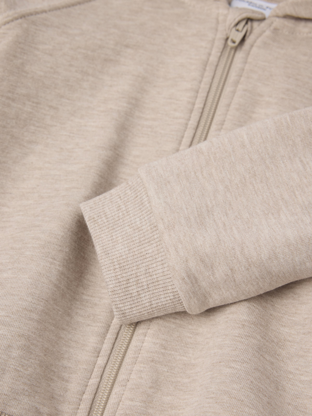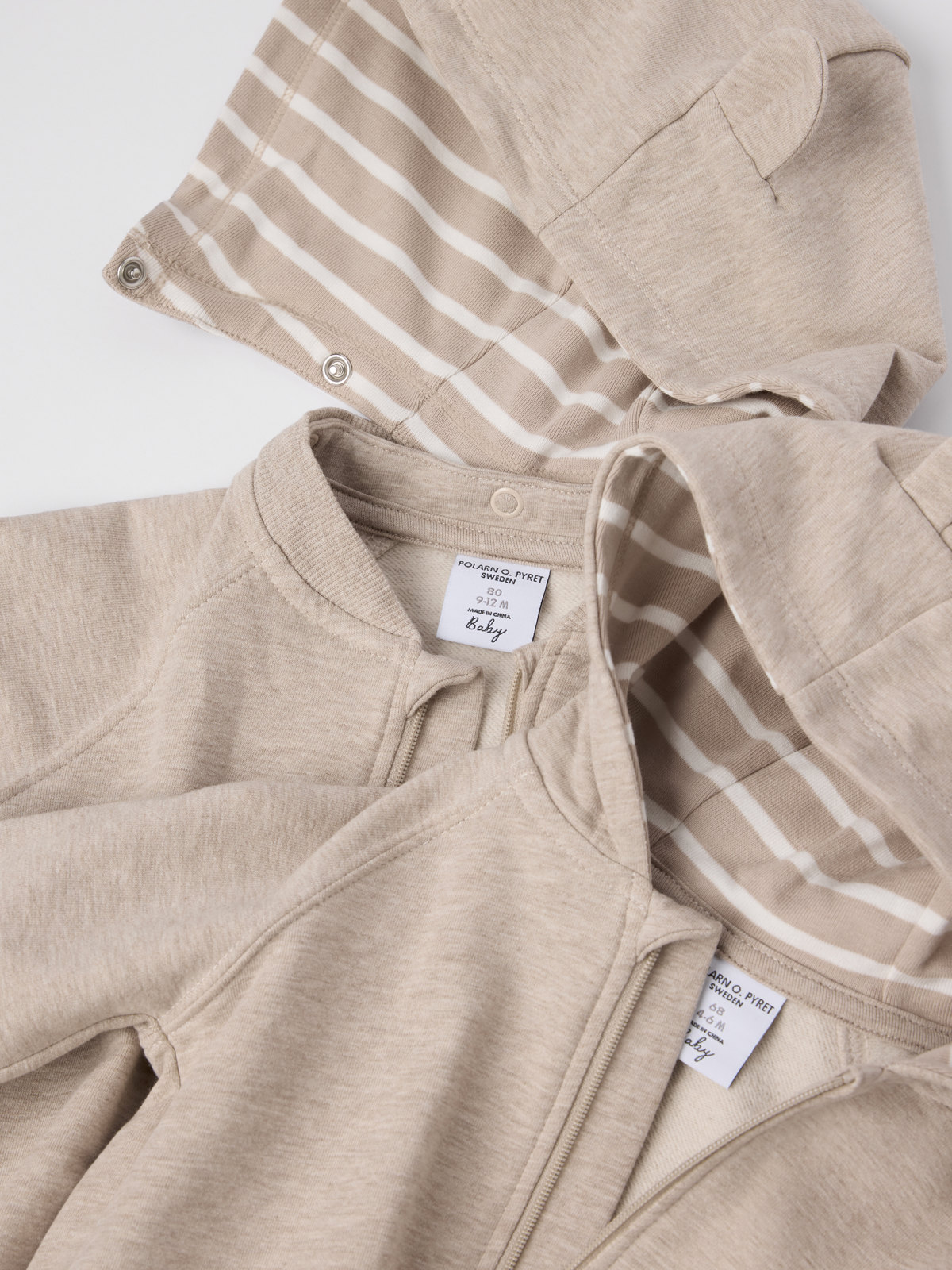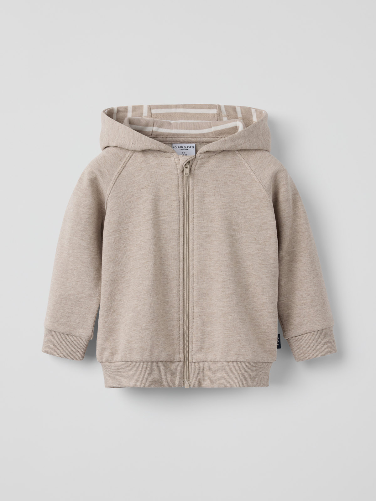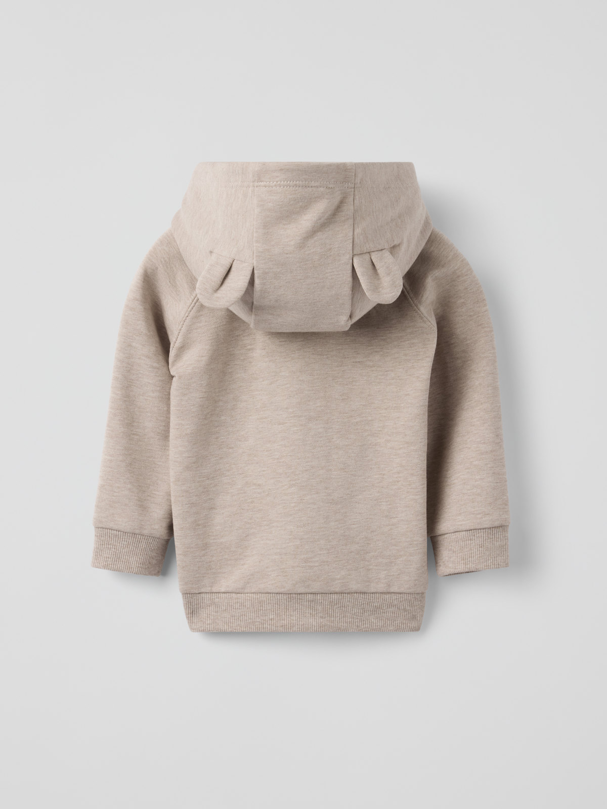 Melierter Hoodie in weicher Sweatshirtqualität aus 100 % Bio-Baumwolle für Babys. Der Hoodie hat eine kuschelige, angeraute Innenseite und eine feste Kapuze mit Jerseyfutter in unserem klassischen Streifenmuster. Die Kapuze ist mit niedlichen kleinen Ohren verziert.