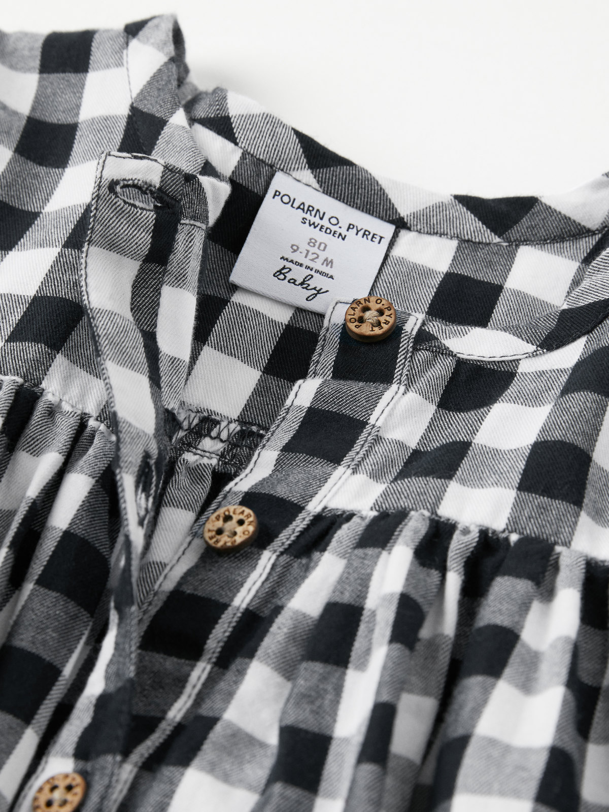 Langärmliges Karokleid aus gewebter Qualität für Babys. Das passt zu jedem Anlass! Das Kleid aus 100 % Bio-Baumwolle wird an der Vorderseite mit Knöpfen geschlossen.