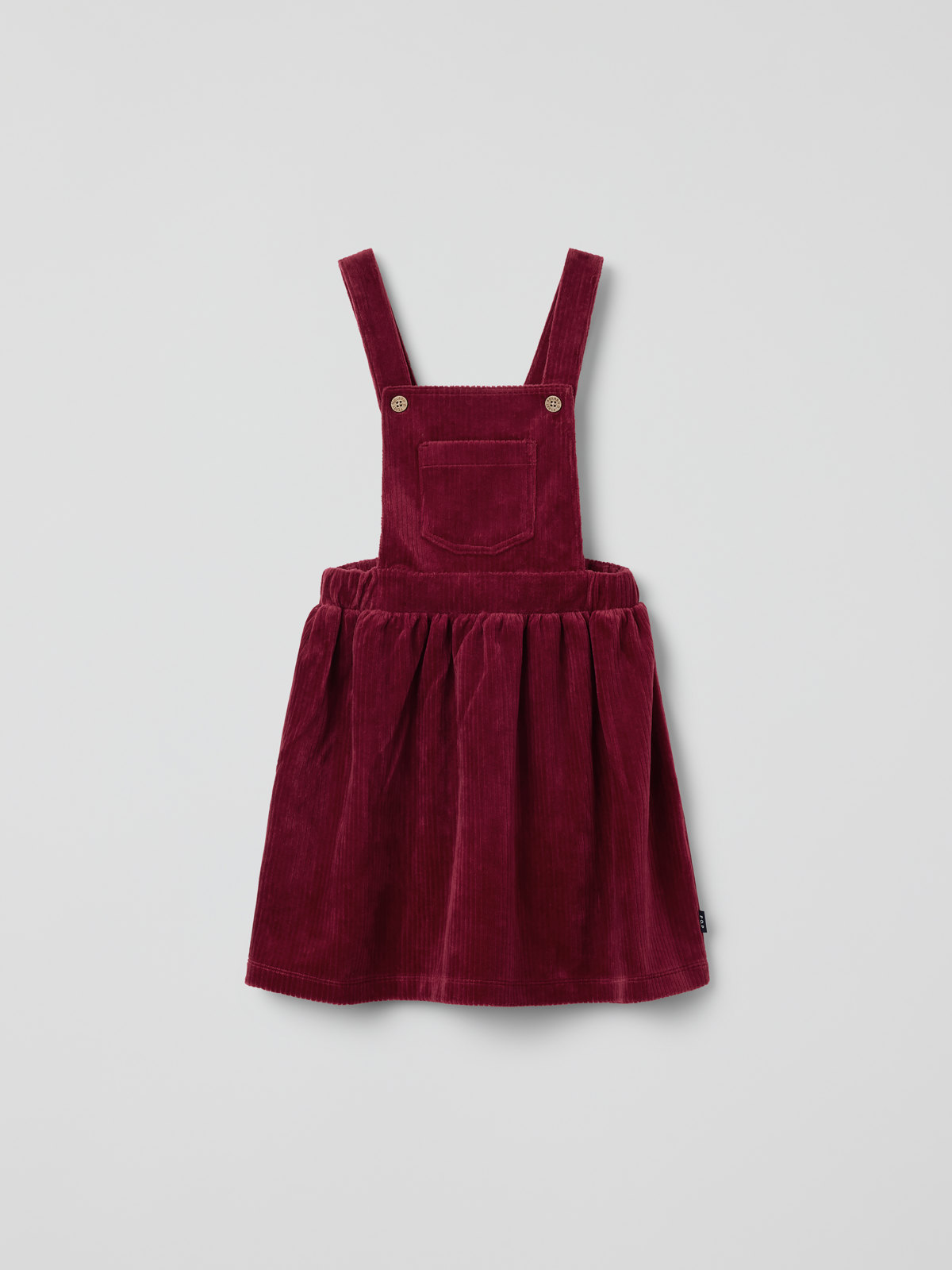 Schürzenkleid aus weichem Cordjersey aus 100 % Bio-Baumwolle – perfekt für Alltag und Feierlichkeiten! Das Kleid hat schmale Träger, die vorne mit einem Knopf geschlossen werden, eine betonte Taille und einen gerafften Rockteil. Außerdem verfügt es über eine dekorative Brusttasche.