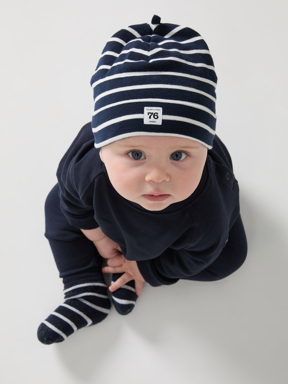 Gestreifte Mütze aus 100 % Bio-Baumwolle. Die Mütze in unserem klassischen Streifenmuster punktet mit einen Umschlag, der sich an die Kopfgröße des Babys anpassen lässt.