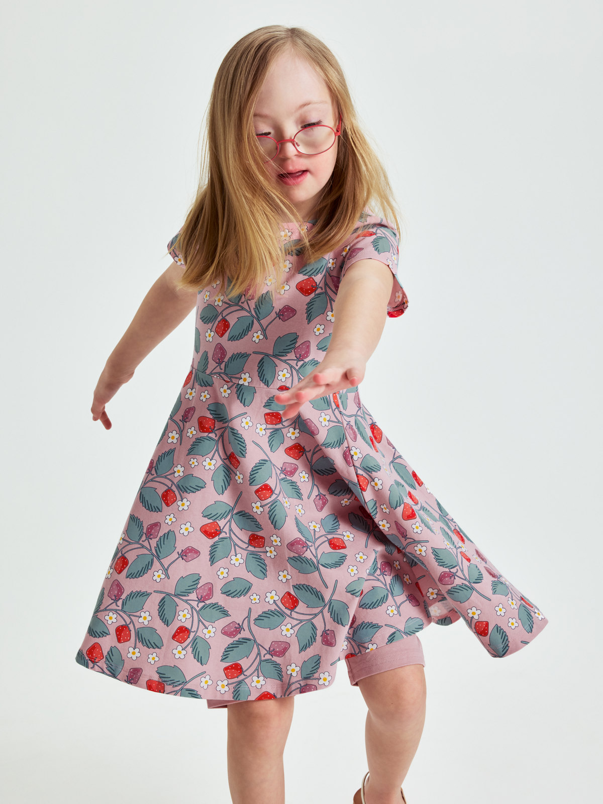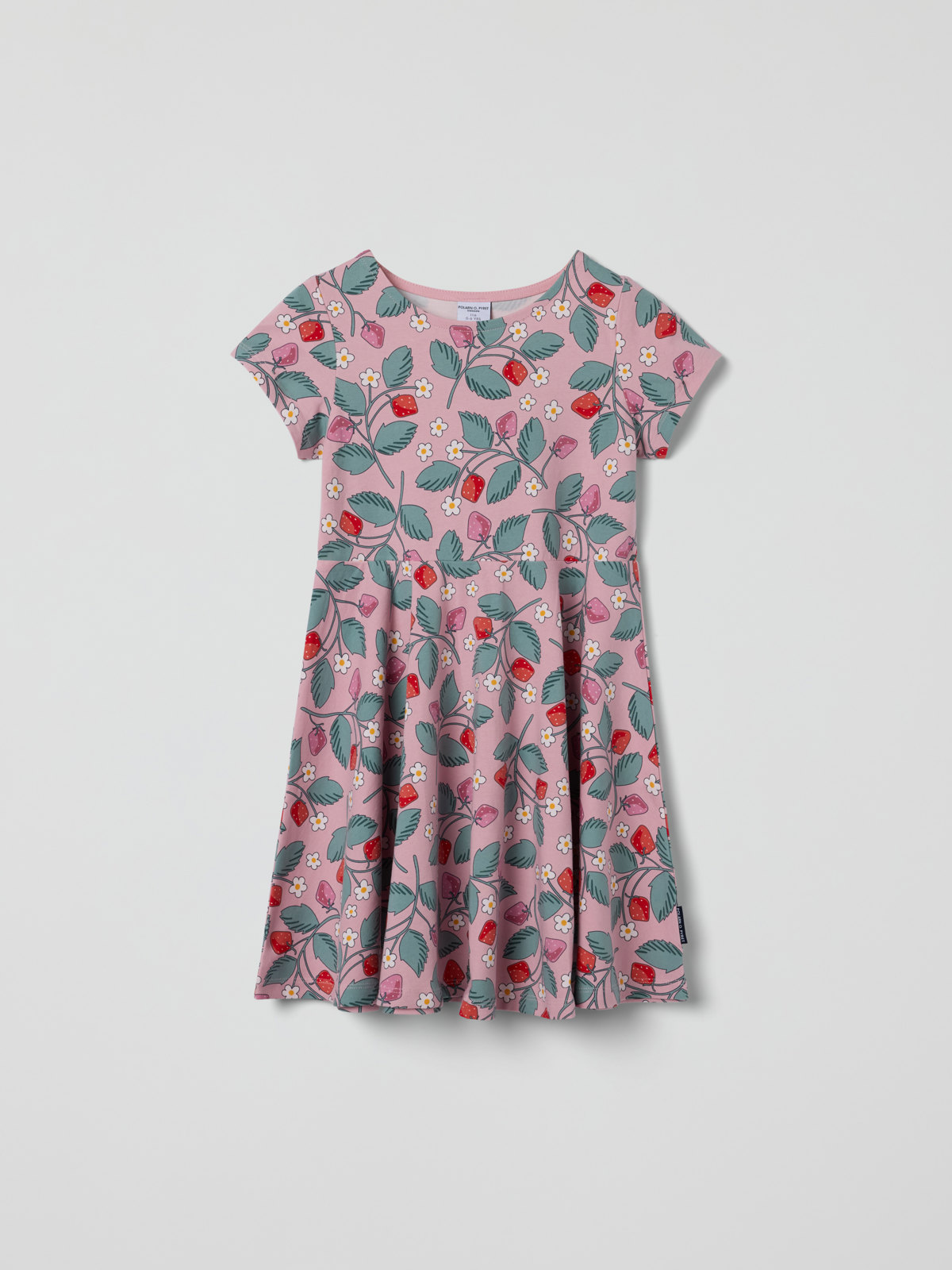 Kurzärmliges Drehkleid aus weicher Bio-Baumwolle. Das darf in keiner Sommergarderobe fehlen! Das Kleid ist durchgehend mit Erdbeeren bedruckt und hat ein besonders weit geschnittenes Rockteil, das beim Drehen wunderschön schwingt. Es wird im Rücken mit einer Knopfleiste geschlossen.