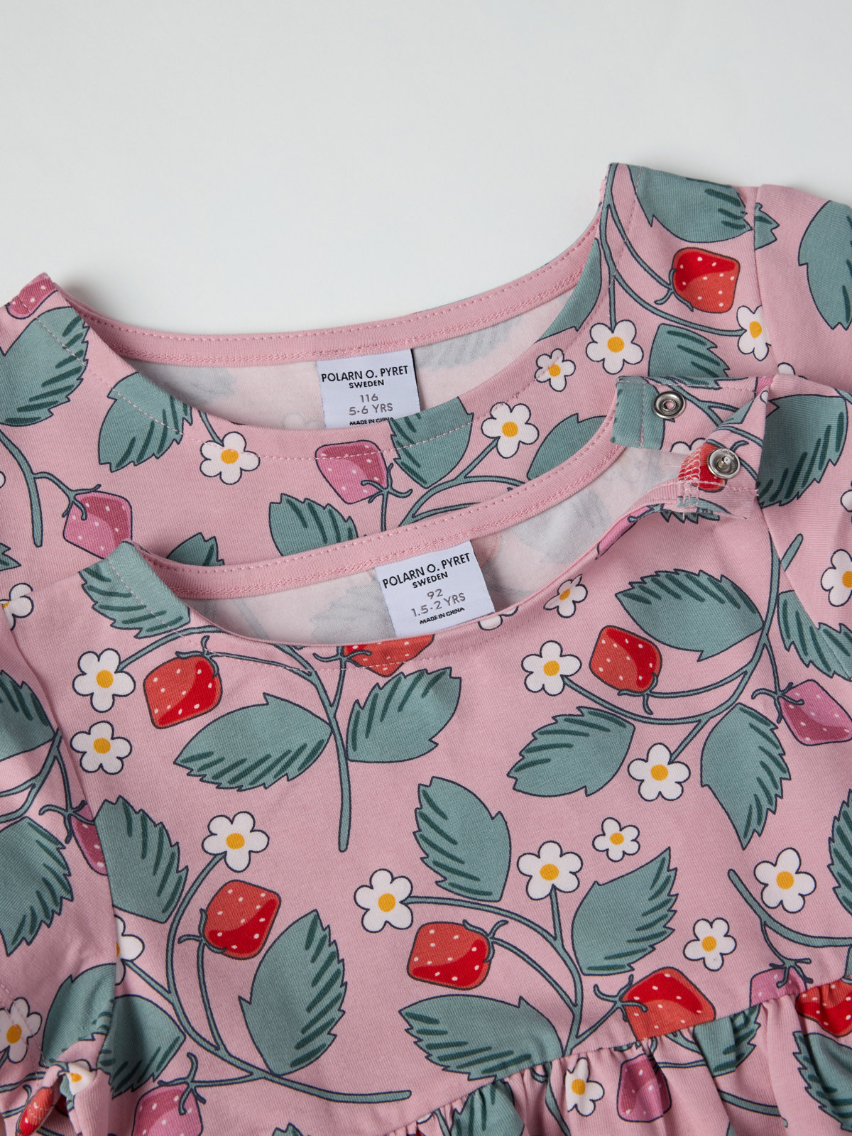 In den Größen 86 bis 92 ist das Kleid in der Taille höher geschnitten. Das Rockteil ist gekräuselt und dank einem Druckknopf auf der einen Schulter lässt es sich leicht an- und ausziehen.