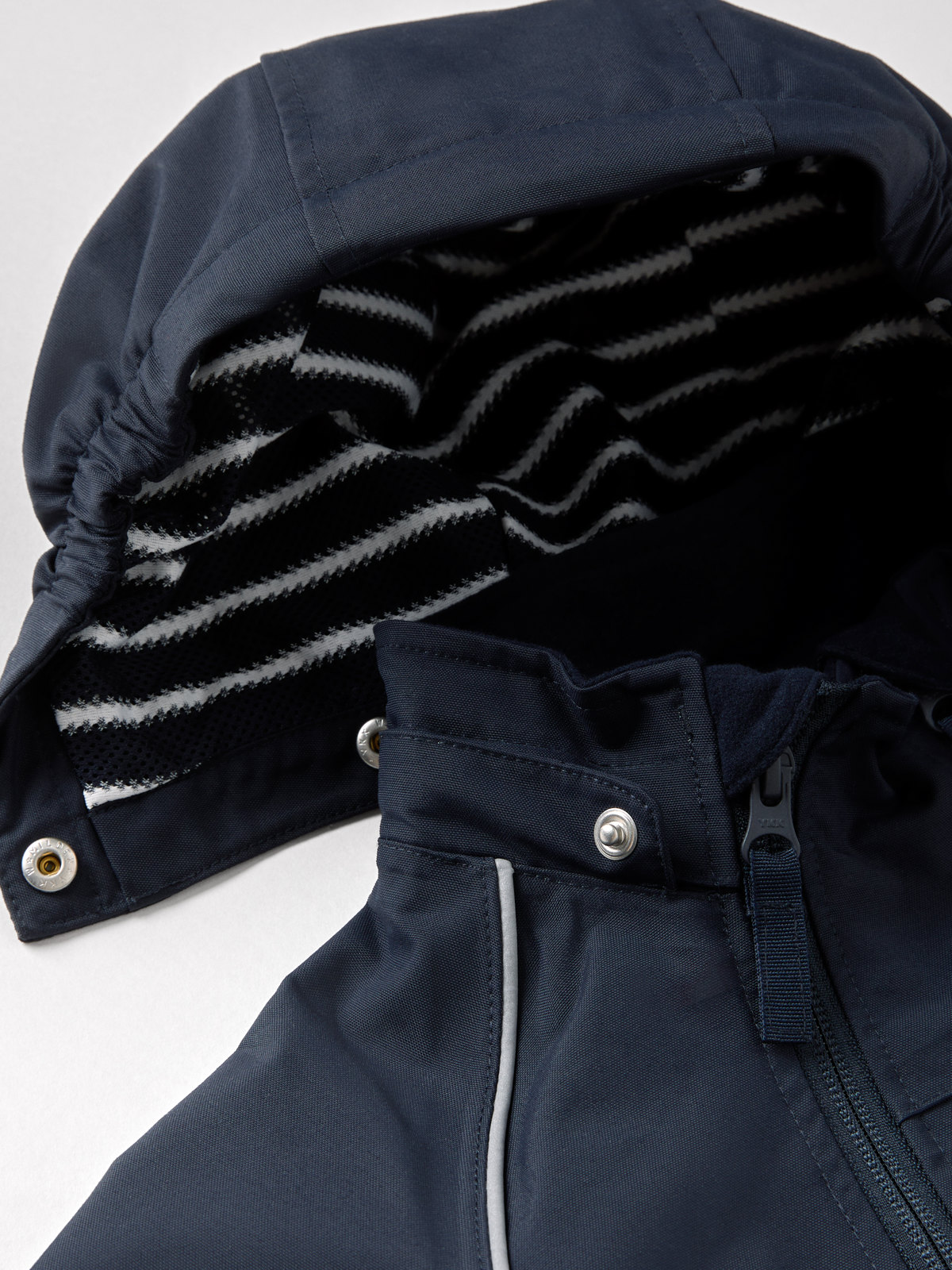 • Die verstellbare Kapuze hat Druckknöpfe für mehr Sicherheit und kann abgenommen werden. Die seitlichen Gummizüge gewährleisten eine gute Passform