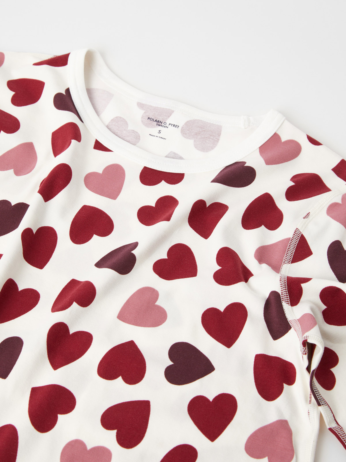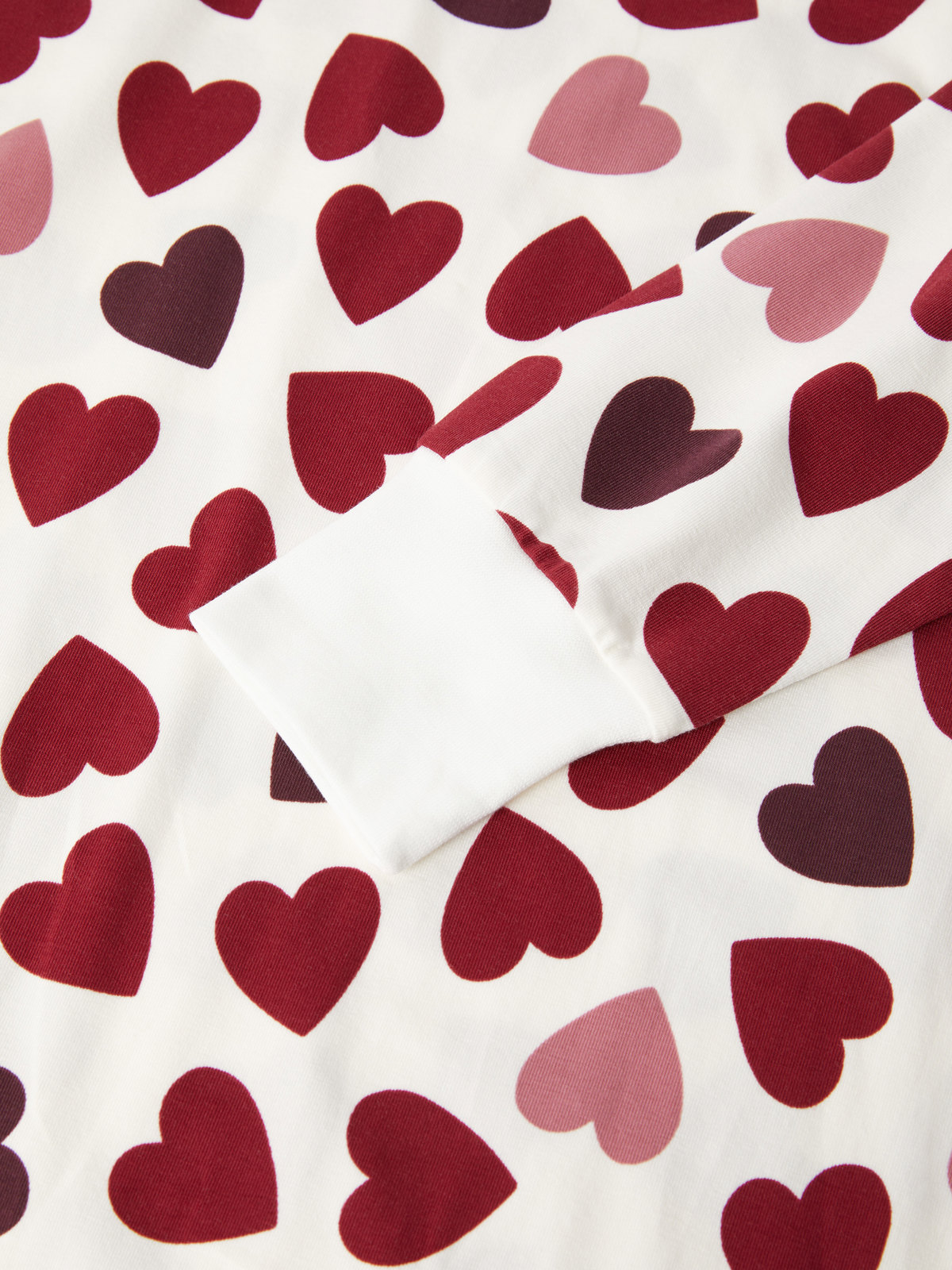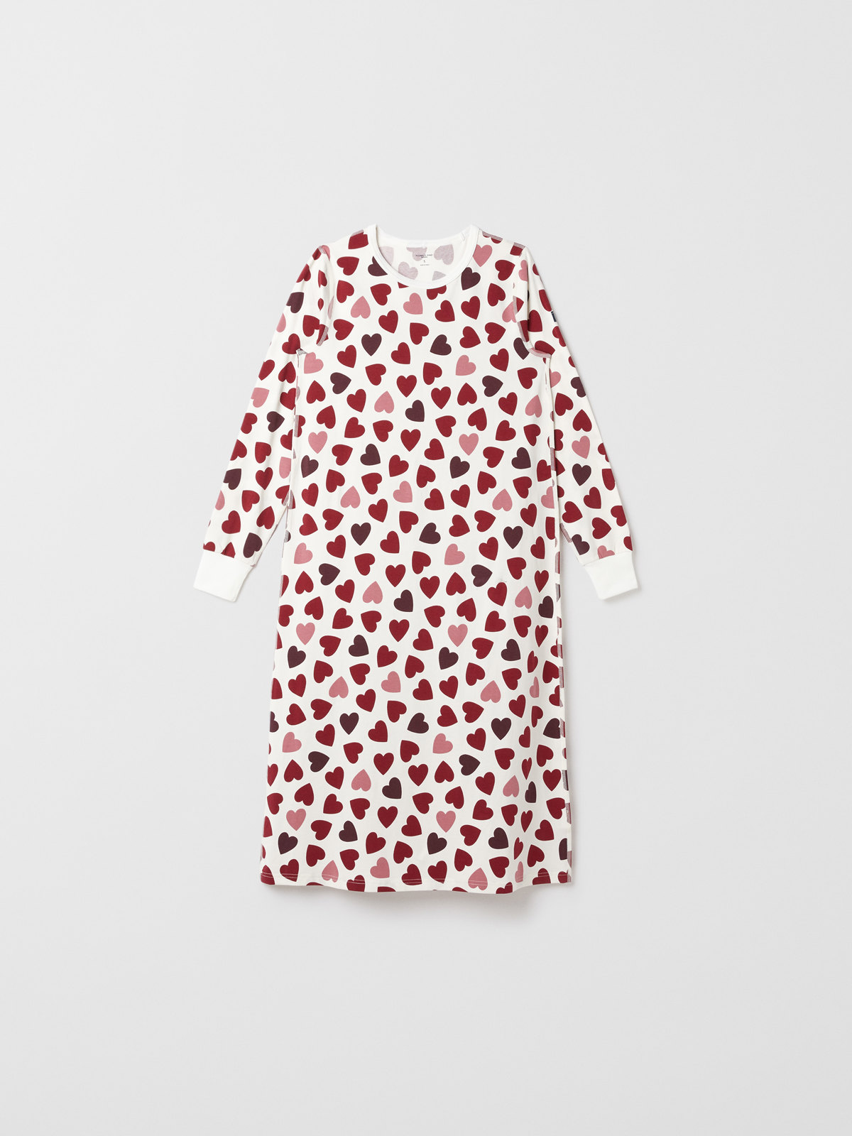 Das Nachthemd ist durchgehend mit kleinen Herzchen bedruckt und hat weiche, einfarbige Bündchen an Ausschnitt und Ärmelabschlüssen.