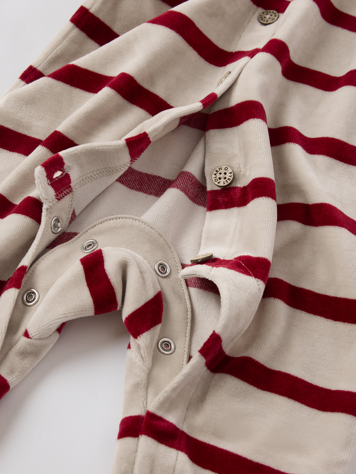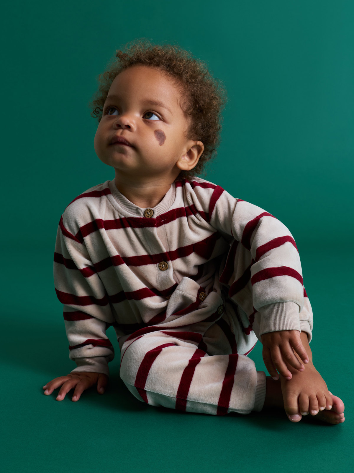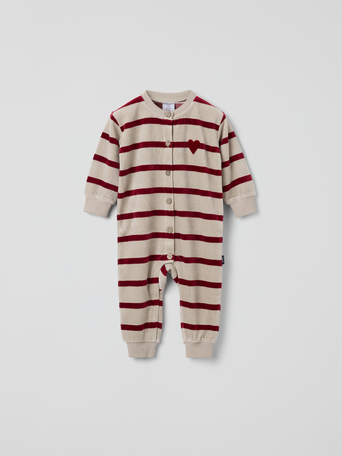 Overall aus weicher und kuscheliger Mischung aus Bio-Baumwolle und recyceltem Polyester – ein Favorit bei Kälte! Der Overall wird vorne mit Knöpfen geschlossen, und die gerippten Bündchen an Armen und Beinen sorgen für eine bequeme Passform. Druckknöpfe im Schritt erleichtern das Umziehen.