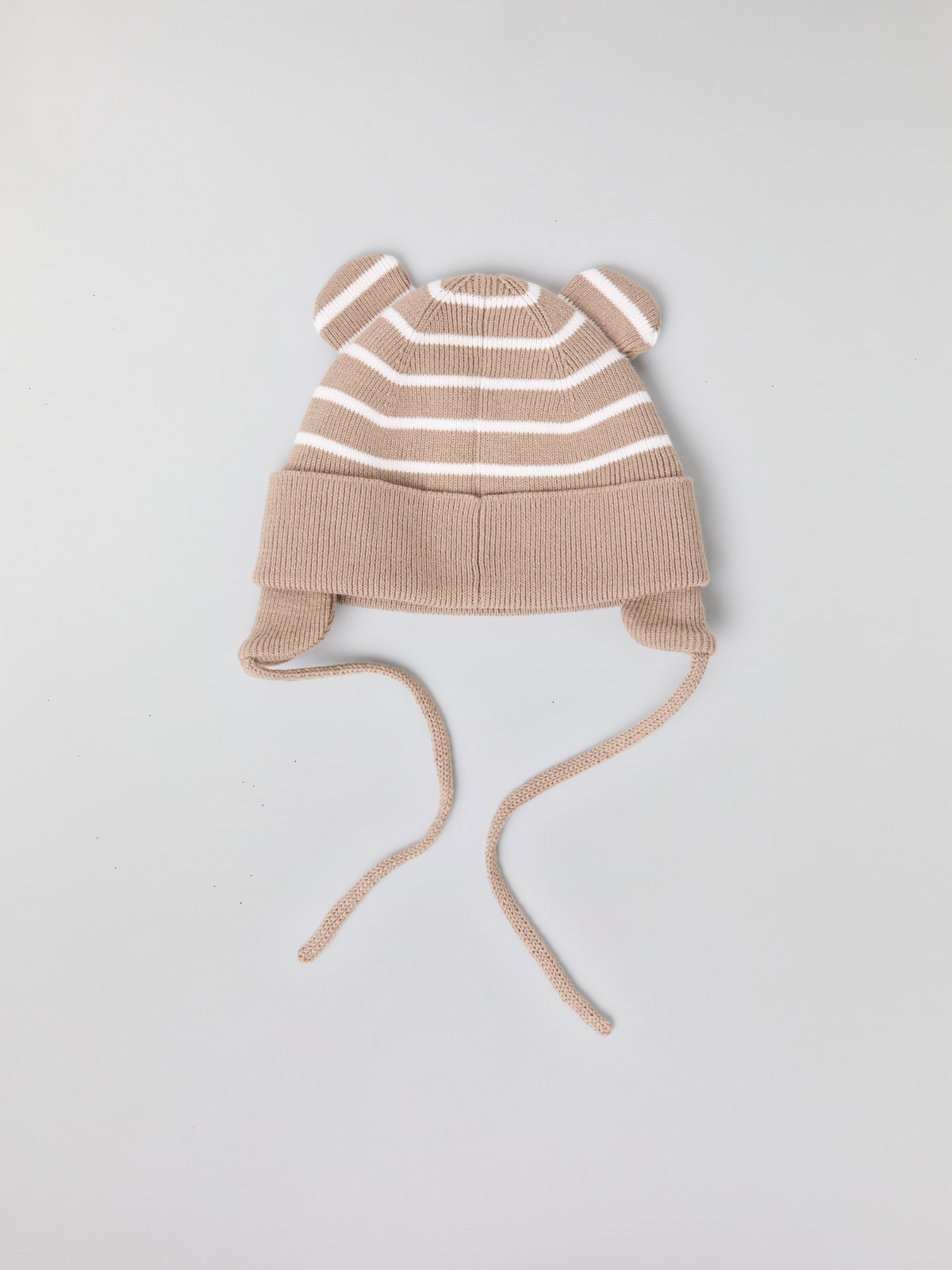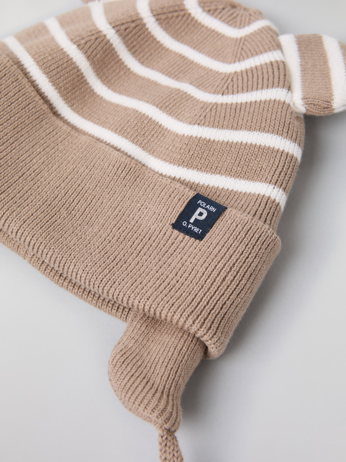 Die Mütze hat unsere klassischen Streifen und angenähte Öhrchen. Sie hat unten ein Rippenbündchen und Ohrenklappen, die kleine Ohren warm halten.