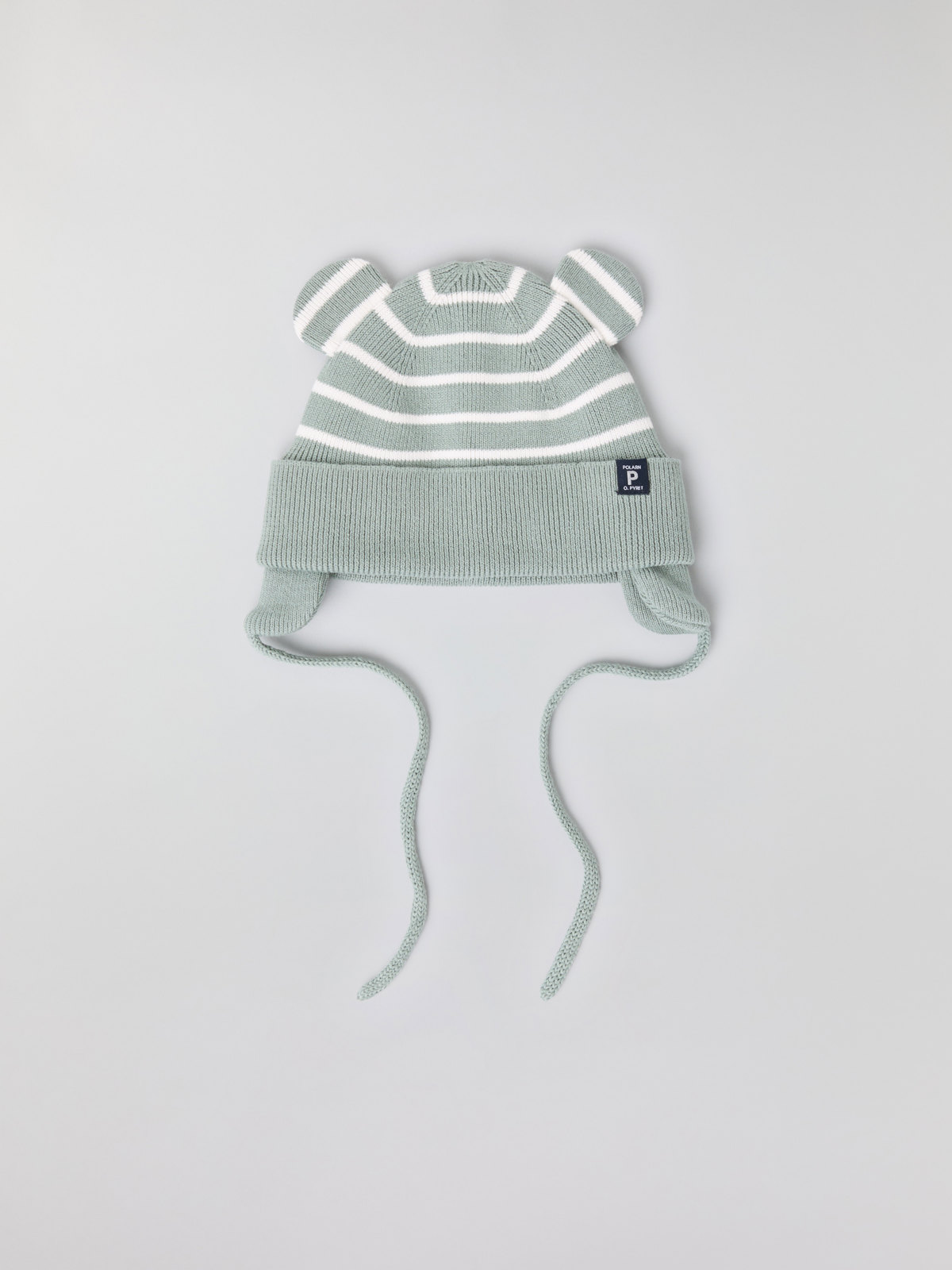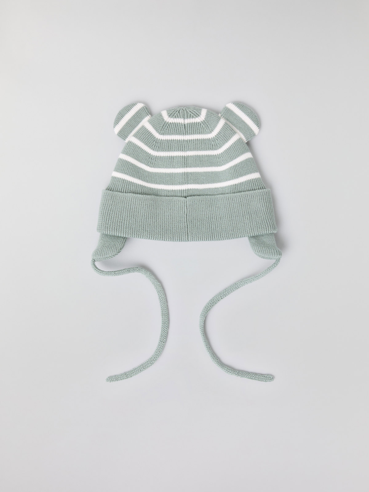 Die Mütze hat unsere klassischen Streifen und angenähte Öhrchen. Sie hat unten ein Rippenbündchen und Ohrenklappen, die kleine Ohren warm halten.