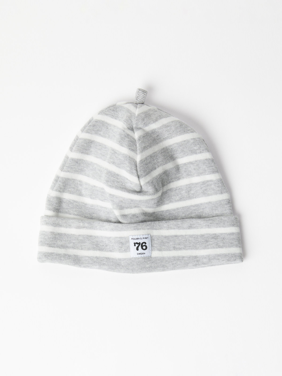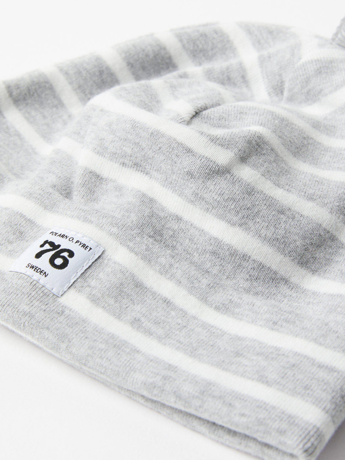 Gestreifte Mütze aus 100 % Bio-Baumwolle. Die Mütze in unserem klassischen Streifenmuster punktet mit einen Umschlag, der sich an die Kopfgröße des Babys anpassen lässt.