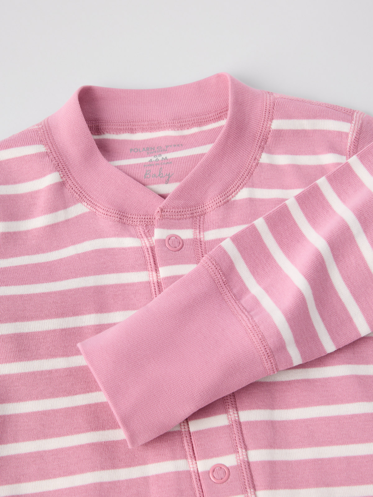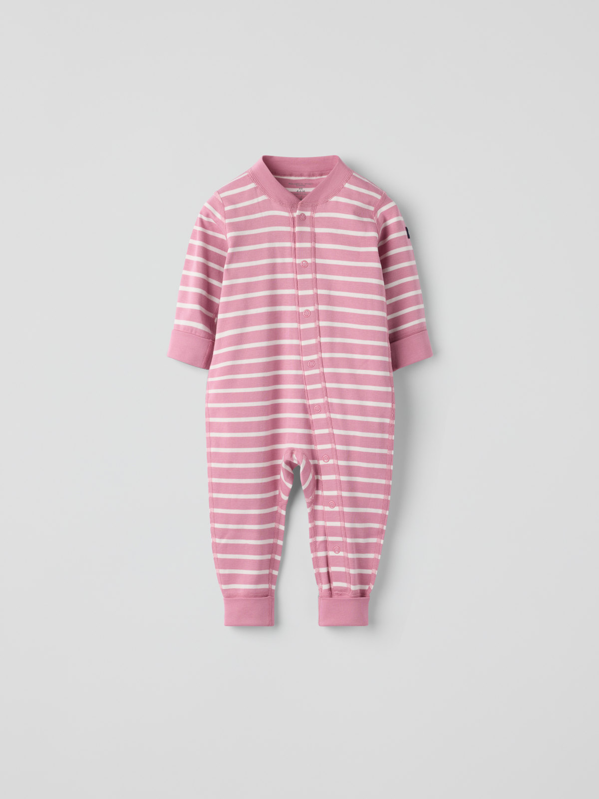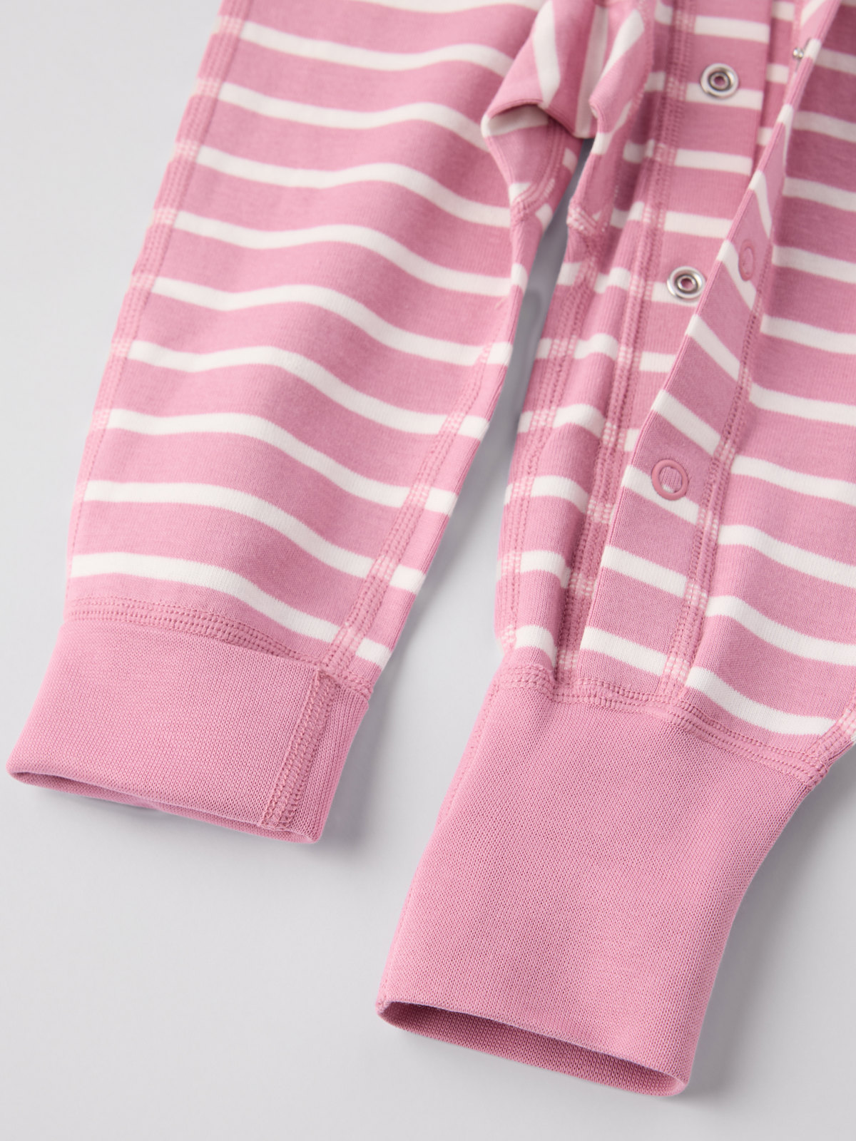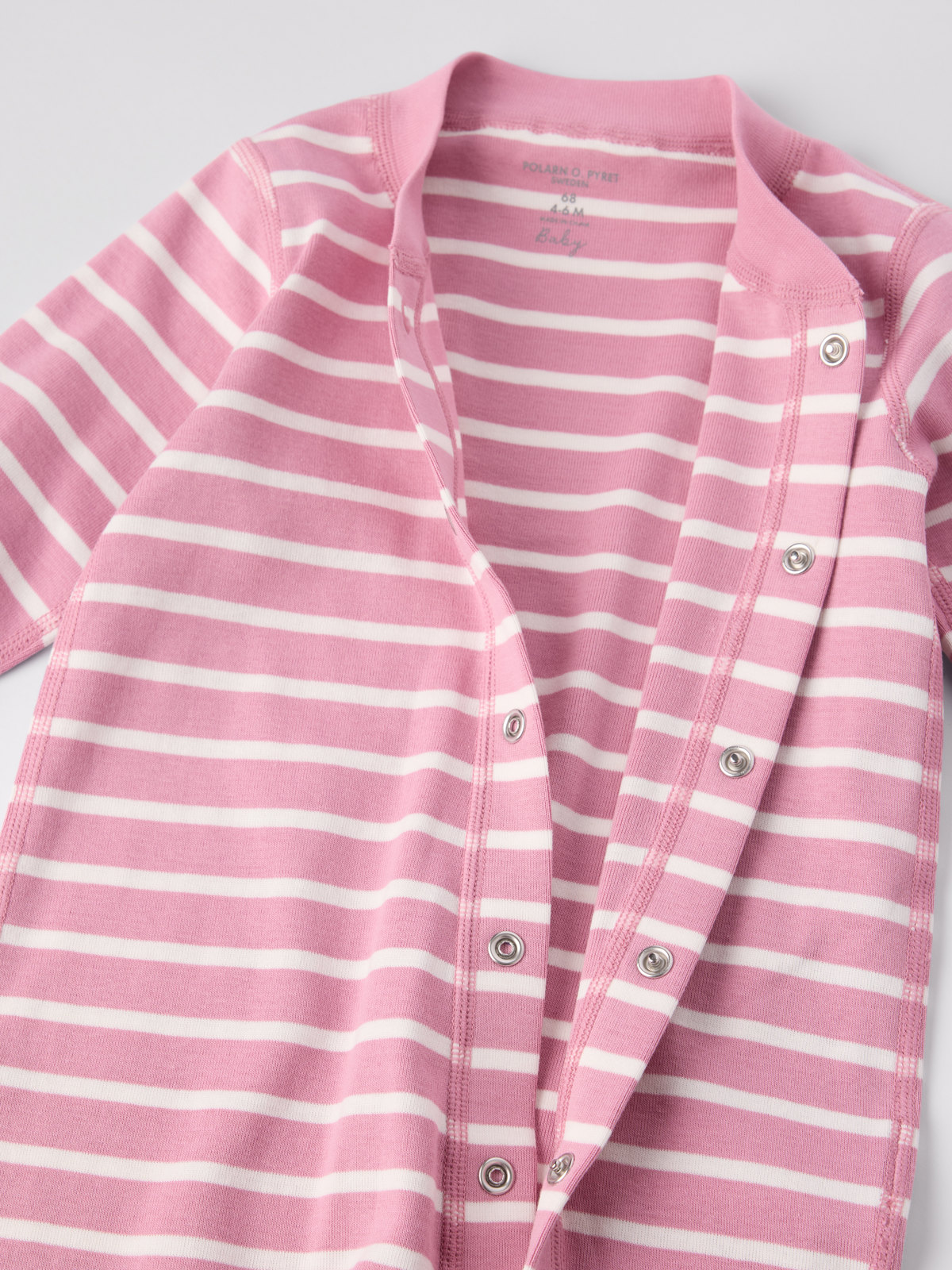 Unser klassischer gestreifter overall aus weicher Bio-Baumwolle – perfekt als Schlafanzug und gemütliches Hausoutfit! Der Overall hat besonders weiche, flache Nähte, die sanft zu empfindlicher Haut sind. Die extra langen Bündchen an Ärmel- und Beinabschlüssen können umgeschlagen werden, dadurch wächst das Kleidungsstück etwas mit deinem Kind mit. Die lange Knopfleiste vom Hals bis zum Beinabschluss erleichtert das An- und Ausziehen.