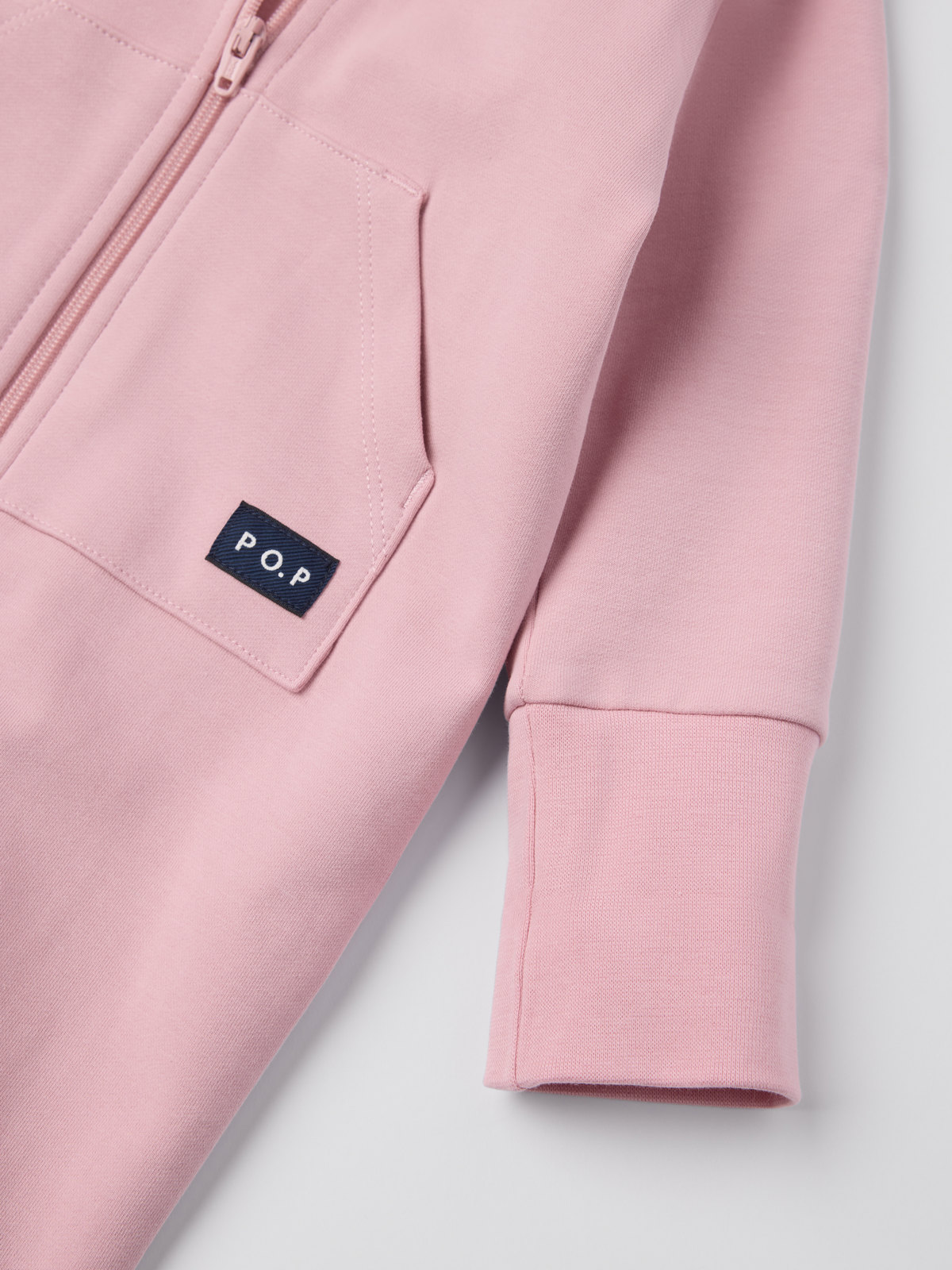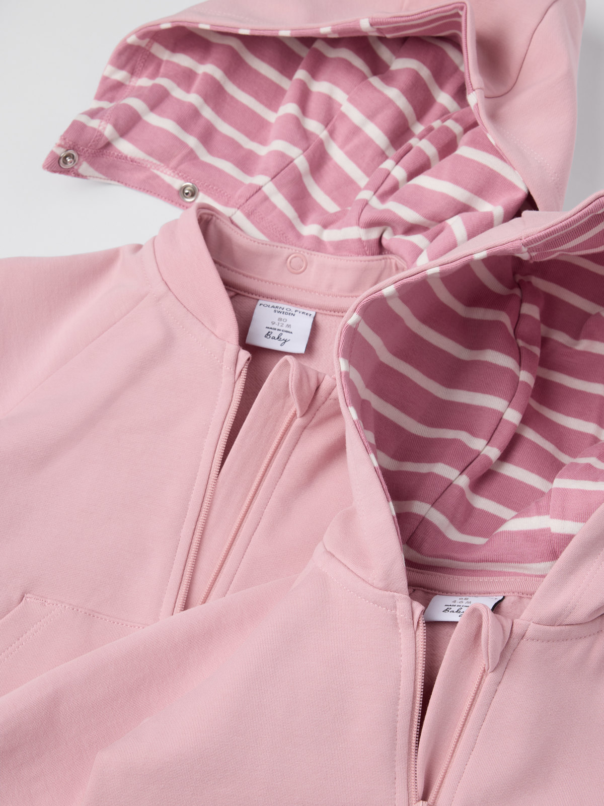 Größe 80 bis 92 hat eine abnehmbare Kapuze, die mit Druckknöpfen befestigt wird.