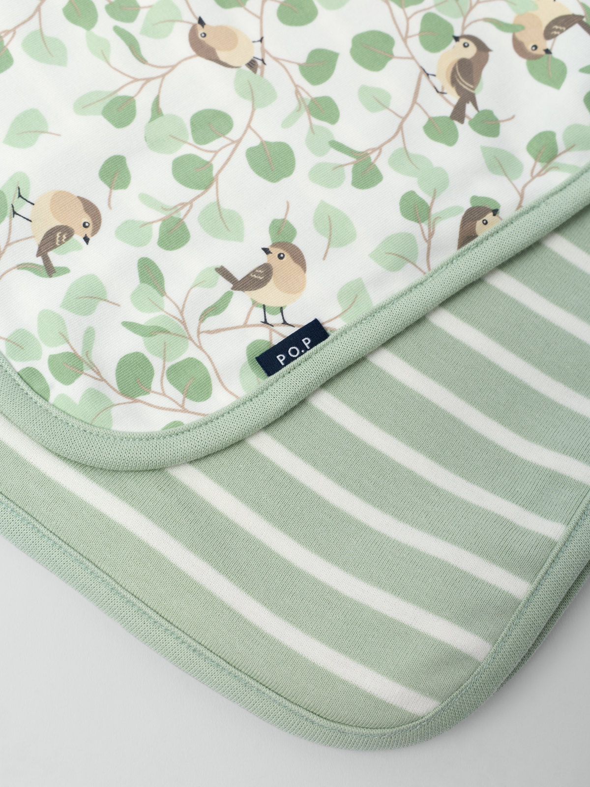 Weiche und kuschelige Babydecke aus Bio-Baumwolle, sanft zur empfindlichen Haut – perfekt für den Kinderwagen oder zuhause. Die Decke hat auf einer Seite einen hübschen Print und auf der anderen unsere klassische Streifenoptik.