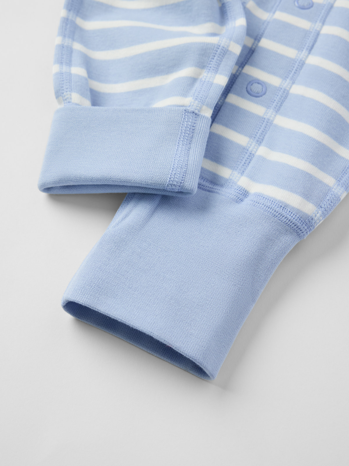 Unser klassischer gestreifter overall aus weicher Bio-Baumwolle – perfekt als Schlafanzug und gemütliches Hausoutfit! Der Overall hat besonders weiche, flache Nähte, die sanft zu empfindlicher Haut sind. Die extra langen Bündchen an Ärmel- und Beinabschlüssen können umgeschlagen werden, dadurch wächst das Kleidungsstück etwas mit deinem Kind mit. Die lange Knopfleiste vom Hals bis zum Beinabschluss erleichtert das An- und Ausziehen.