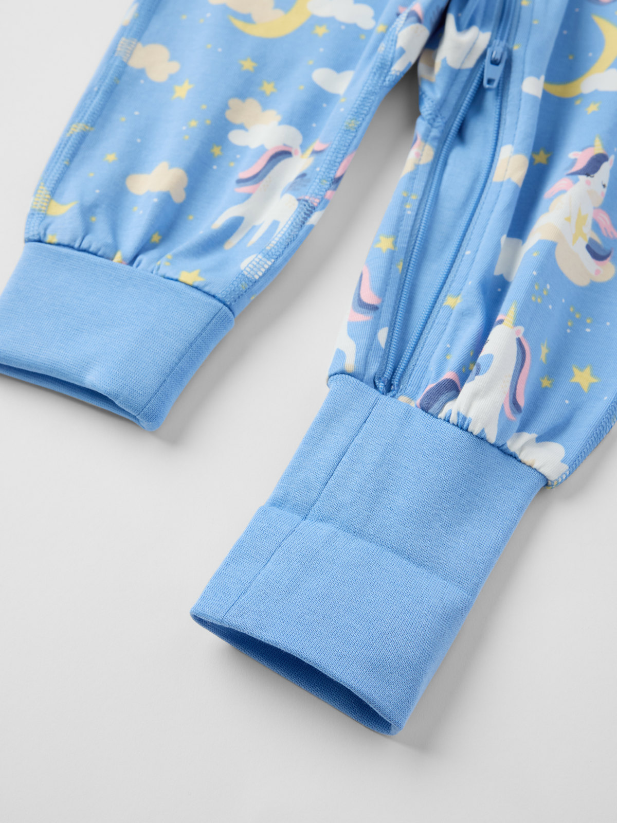 Schlafoverall aus weicher Bio-Baumwolle mit besonders weichen, flachen Nähten, die sanft zu empfindlicher Haut sind. Die extra langen Bündchen an Ärmel- und Beinabschlüssen können umgeschlagen werden, dadurch wächst das Kleidungsstück etwas mit deinem Kind mit. Der lange Reißverschluss reicht vom Hals bis zum Beinabschluss und kann von oben und unten geöffnet werden; das ist praktisch beim An- und Ausziehen.