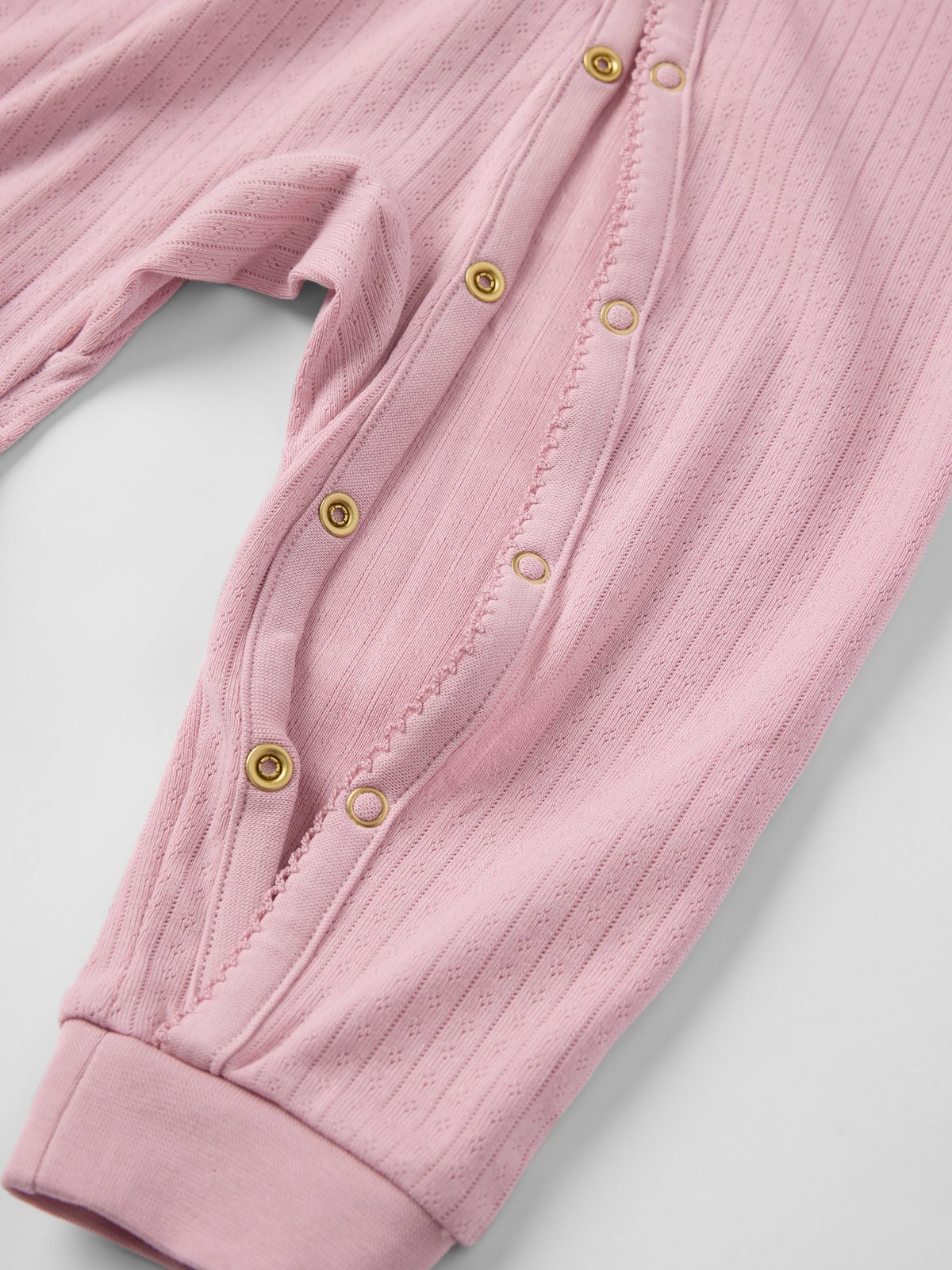 Schlafanzug-Overall aus weichem Pointeille-Gewebe aus Tencel™ Lyocell und Bio-Baumwolle, genäht mit extra weichen, flachen Nähten, die empfindliche Haut schonen. Der Overall hat gerade Ärmel und Bündchen an den Beinabschlüssen für eine bequeme Passform. Die lange Knopfleiste vom Hals bis zum Beinabschluss erleichtert das An- und Ausziehen.