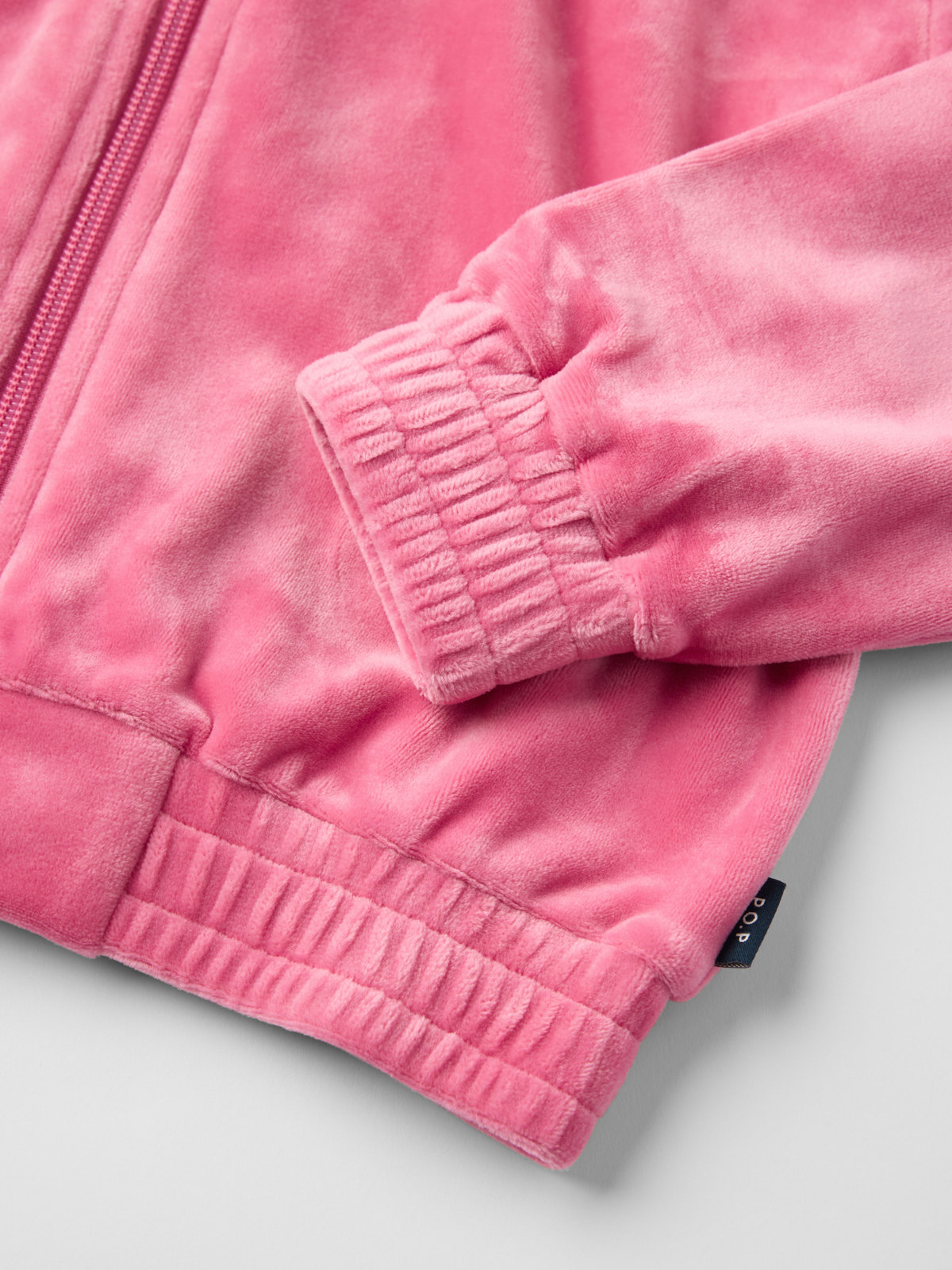 Jacke aus weichem Velours aus recyceltem Polyester. Der Jacken hat einen langen Zipper, der leicht in den Kragen übergeht, sowie Rippbündchen an Ärmeln und Saum für eine bequeme Passform. Vorn ist ein kontrastfarbiges, gesticktes Logo angebracht.