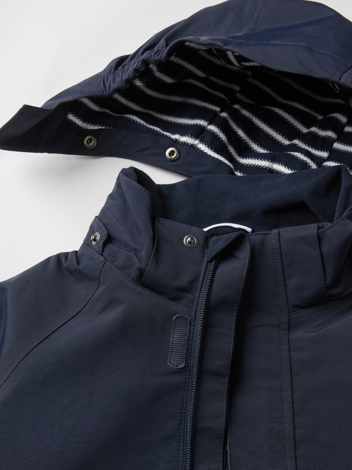 • Die verstellbare Kapuze hat Druckknöpfe für mehr Sicherheit und kann abgenommen werden. Die seitlichen Gummizüge gewährleisten eine gute Passform