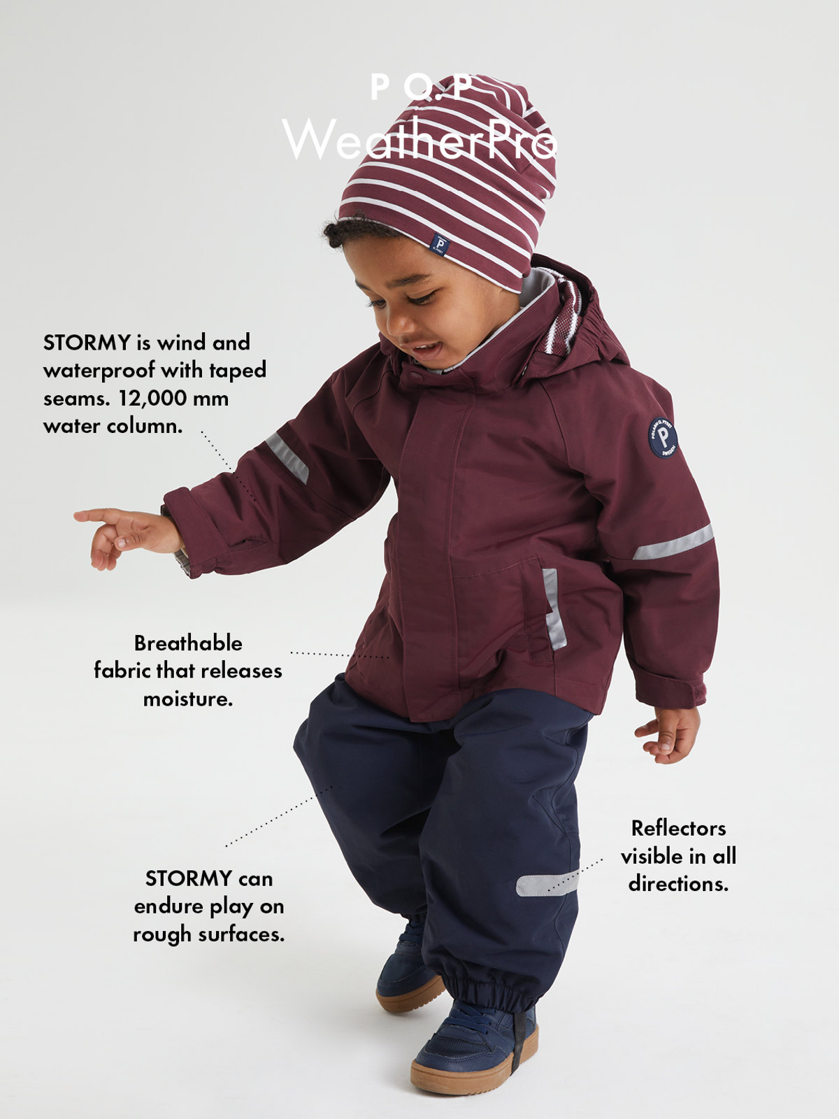 Mit PO.P WeatherPro® gekennzeichnete Modelle erfüllen sämtliche Anforderungen, die wir in Sachen Strapazierfähigkeit, Wasserdichtigkeit, Atmungsaktivität oder Kindersicherheit an Outdoor-Bekleidung stellen.
