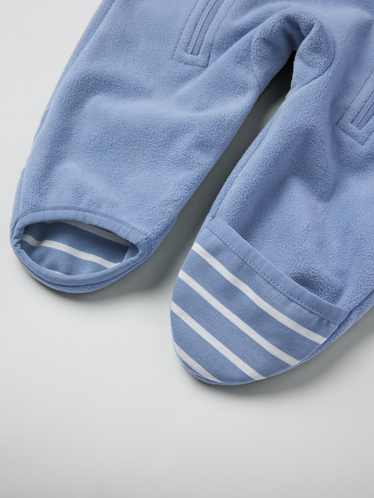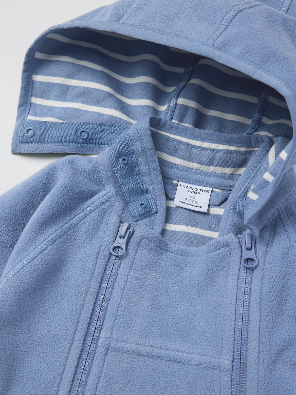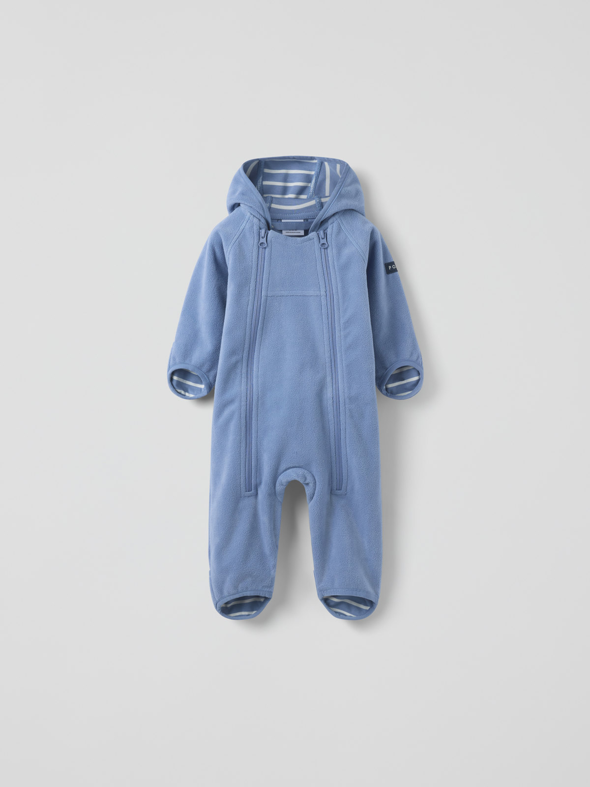 Winddichter, wasserabweisender Windfleece-Overall für Babys. Perfekt im Kinderwagen! Der Overall aus recyceltem Polyester ist atmungsaktiv und mit gemütlichem Trikot aus 100 % Bio-Baumwolle mit unseren klassischen Streifen gefüttert. Er hat eine fest angesetzte Kapuze und zwei Reißverschlüsse an der Vorderseite, die das An- und Ausziehen erleichtern.