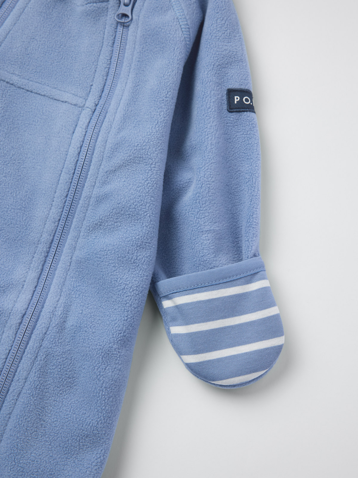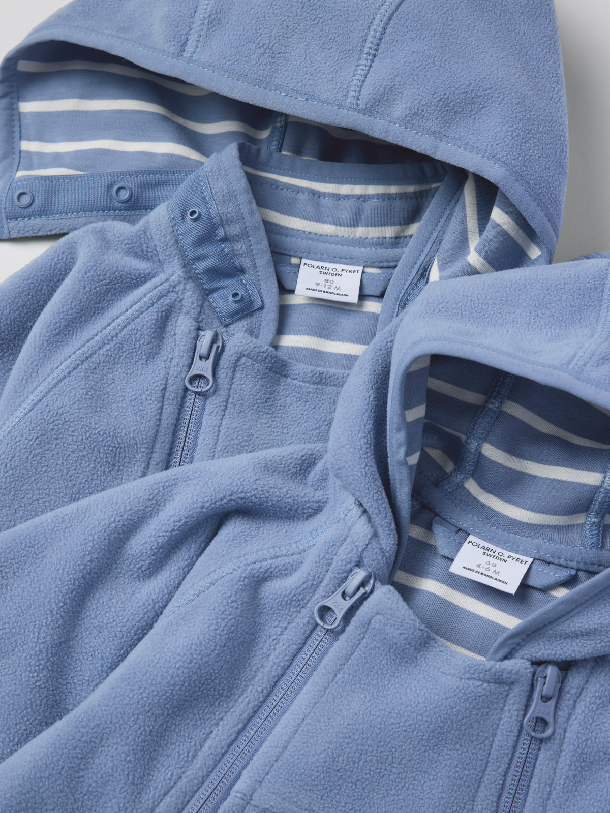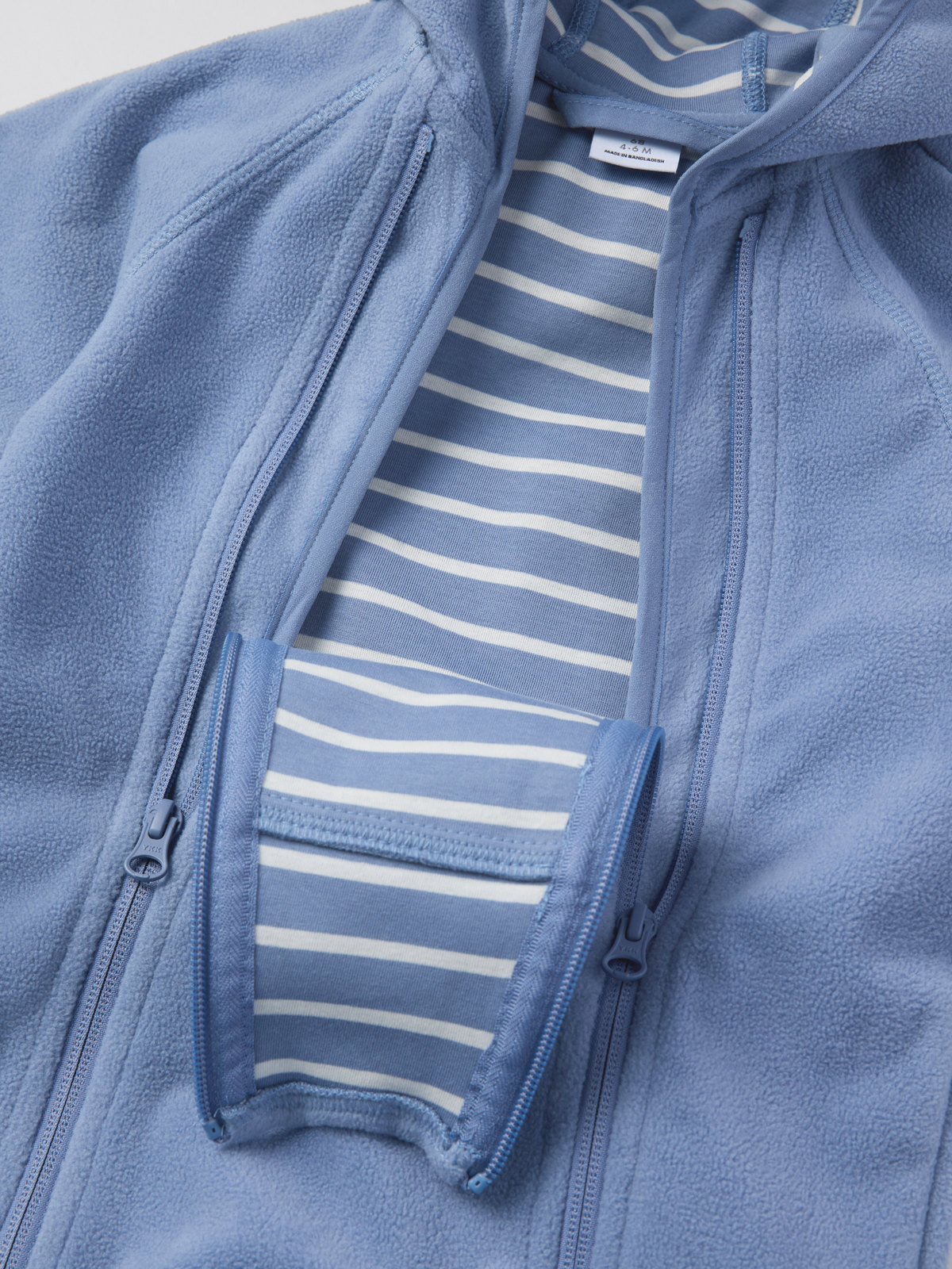 Winddichter, wasserabweisender Windfleece-Overall für Babys. Perfekt im Kinderwagen! Der Overall aus recyceltem Polyester ist atmungsaktiv und mit gemütlichem Trikot aus 100 % Bio-Baumwolle mit unseren klassischen Streifen gefüttert. Er hat eine fest angesetzte Kapuze und zwei Reißverschlüsse an der Vorderseite, die das An- und Ausziehen erleichtern.