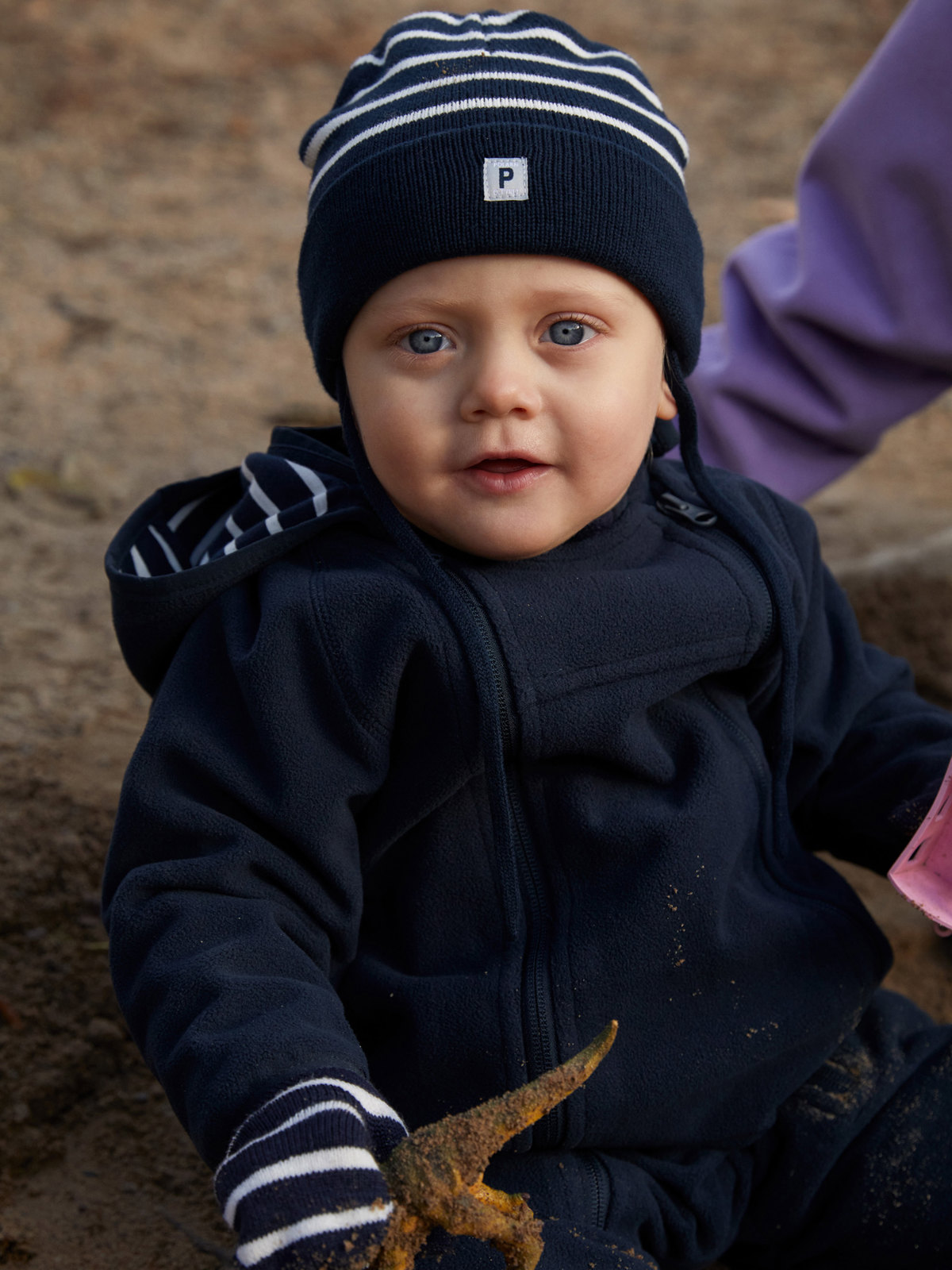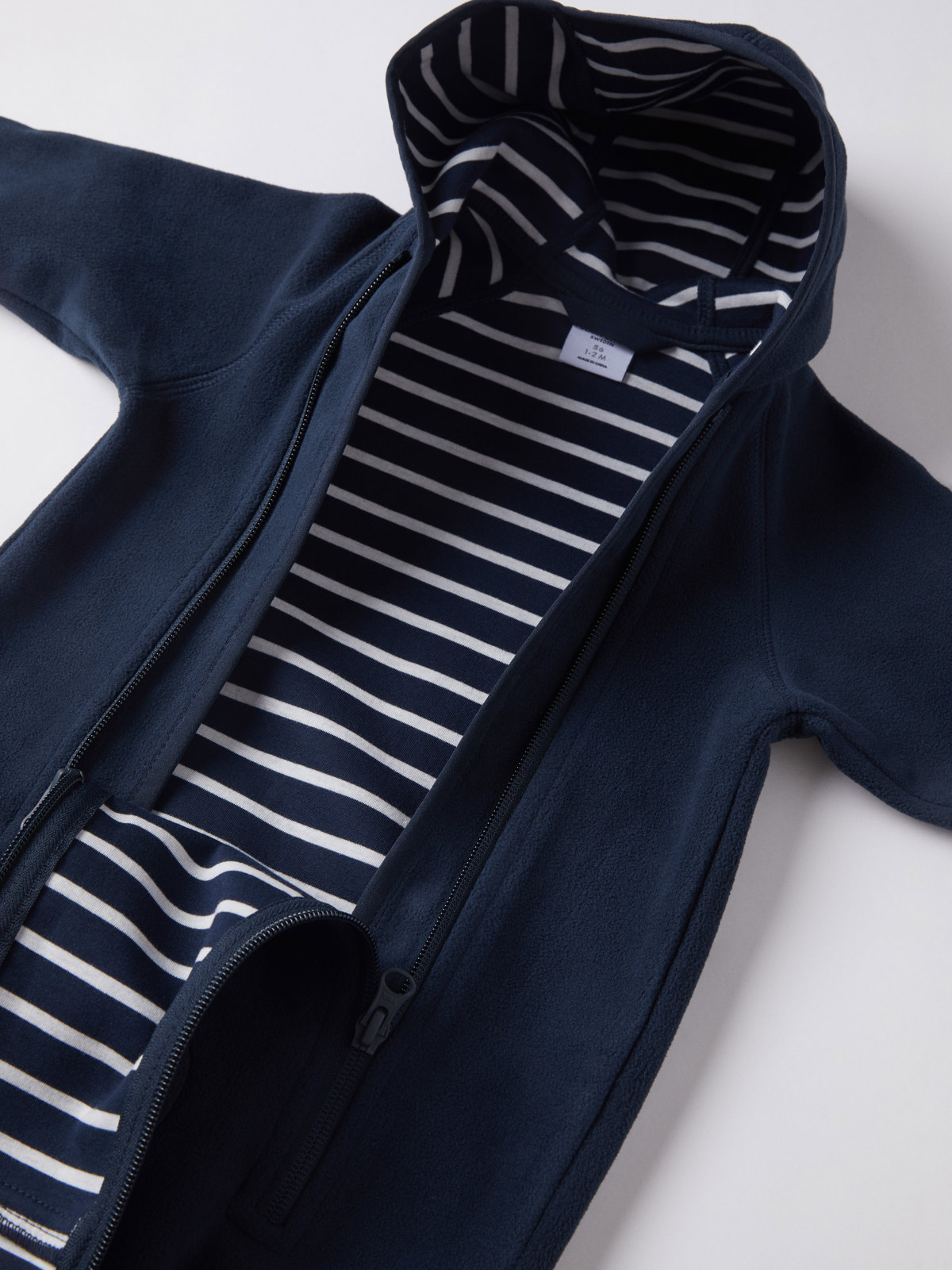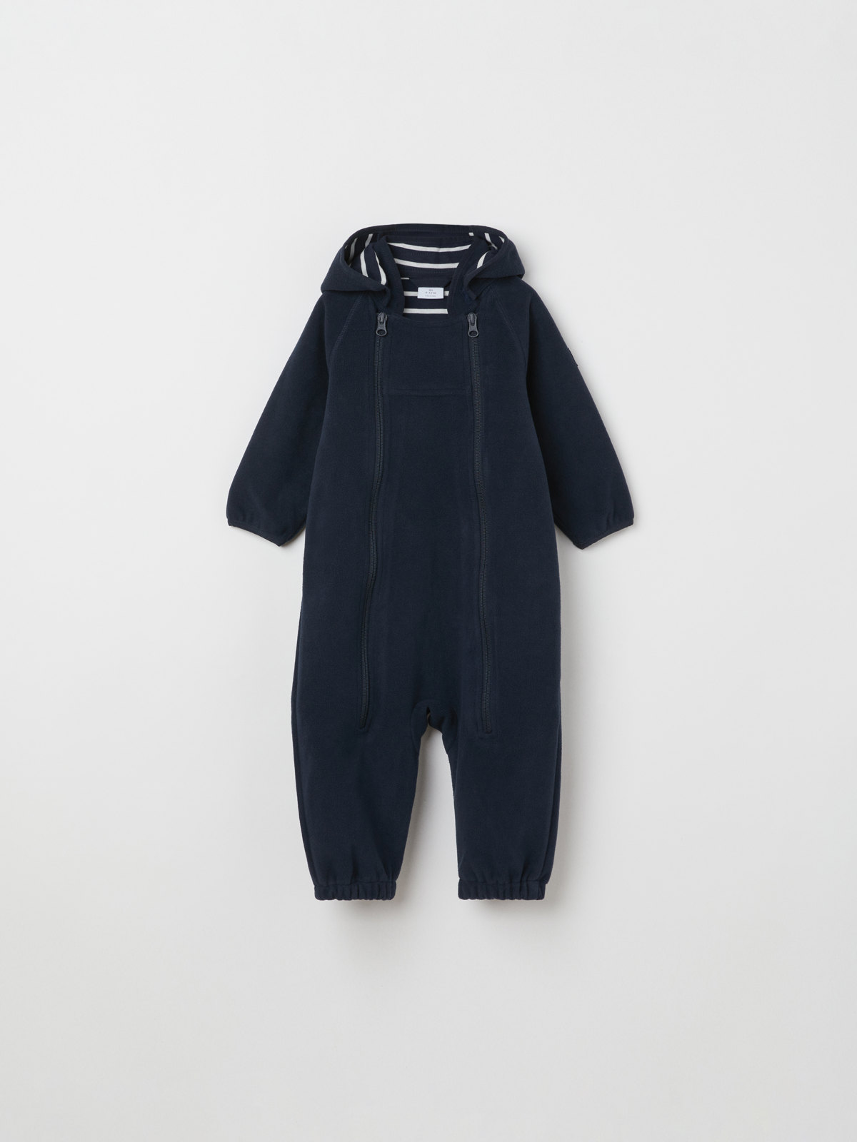 Der Overall aus recyceltem Polyester ist atmungsaktiv und mit gemütlichem Trikot aus 100 % Bio-Baumwolle mit unseren klassischen Streifen gefüttert. Der Overall hat eine Kapuze und doppelte Reißverschlüsse an der Vorderseite, die das An- und Ausziehen erleichtern. Die Reißverschlüsse sind mit einer inwendigen Windschutzleiste ausgestattet, die vor kaltem Wind schützt. Ein Kinnschutz am oberen Ende verhindert unangenehmes Kratzen an Hals und Wangen.