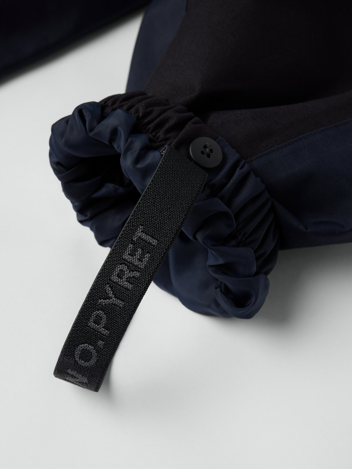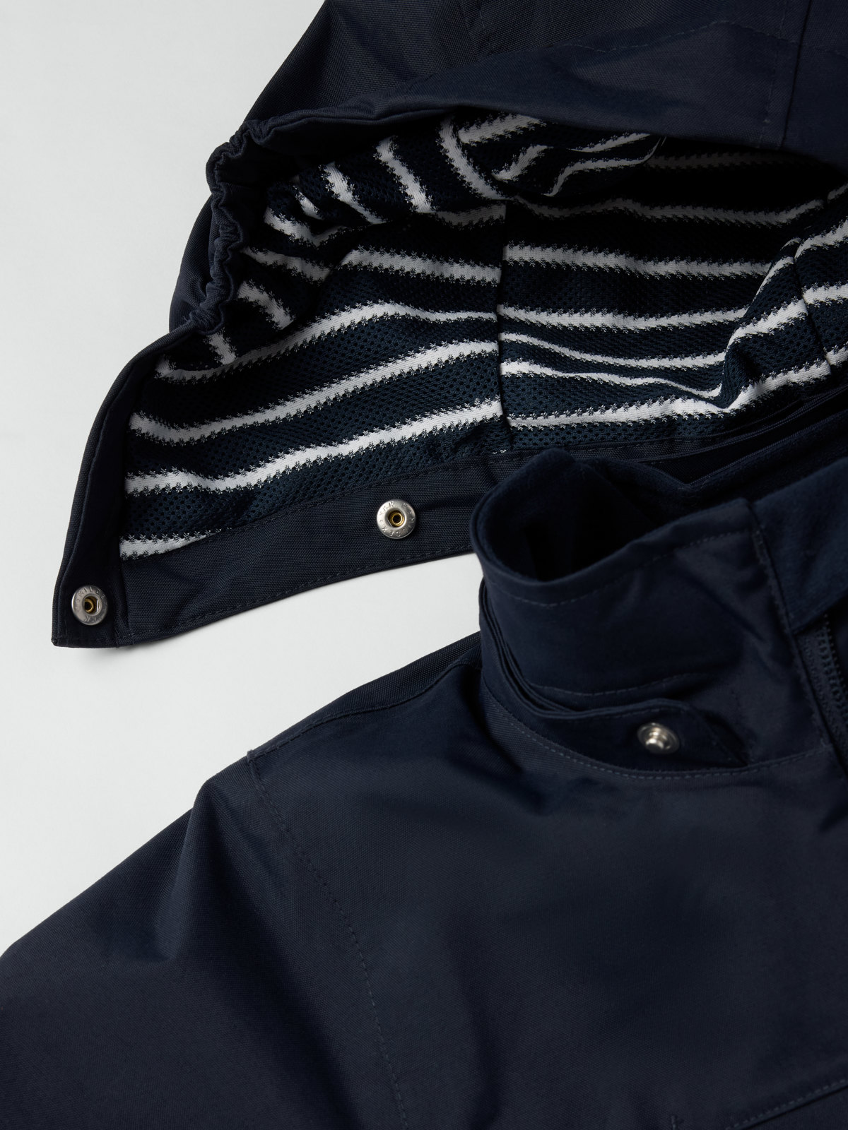 • Die verstellbare Kapuze hat Druckknöpfe für mehr Sicherheit und kann abgenommen werden. Die seitlichen Gummizüge gewährleisten eine gute Passform
