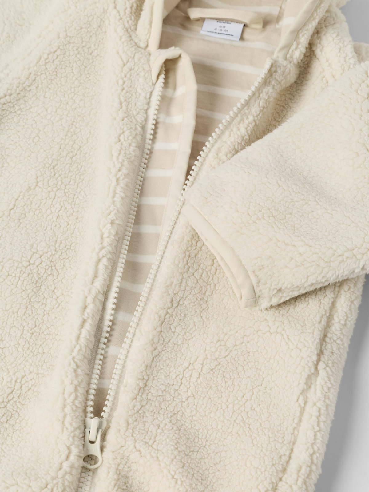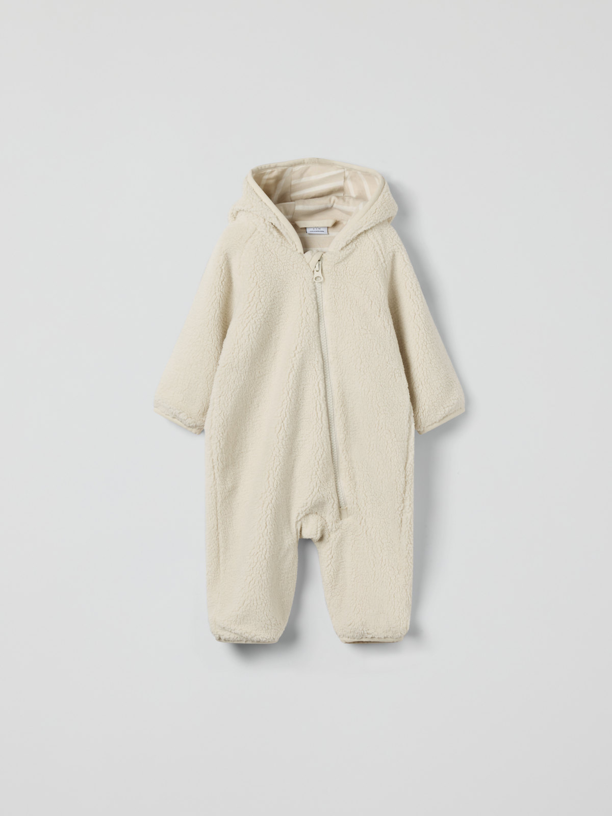 Overall aus weichem Pile für Babys – ein richtig kuscheliger Favorit für Kinderwagen und Arm! Der Overall ist aus recyceltem Polyester gefertigt und hat ein weiches Jerseylining aus 100 % Bio-Baumwolle mit unserem klassischen Streifenmuster. Die Kapuze ist mit kleinen angenähten Ohren versehen.