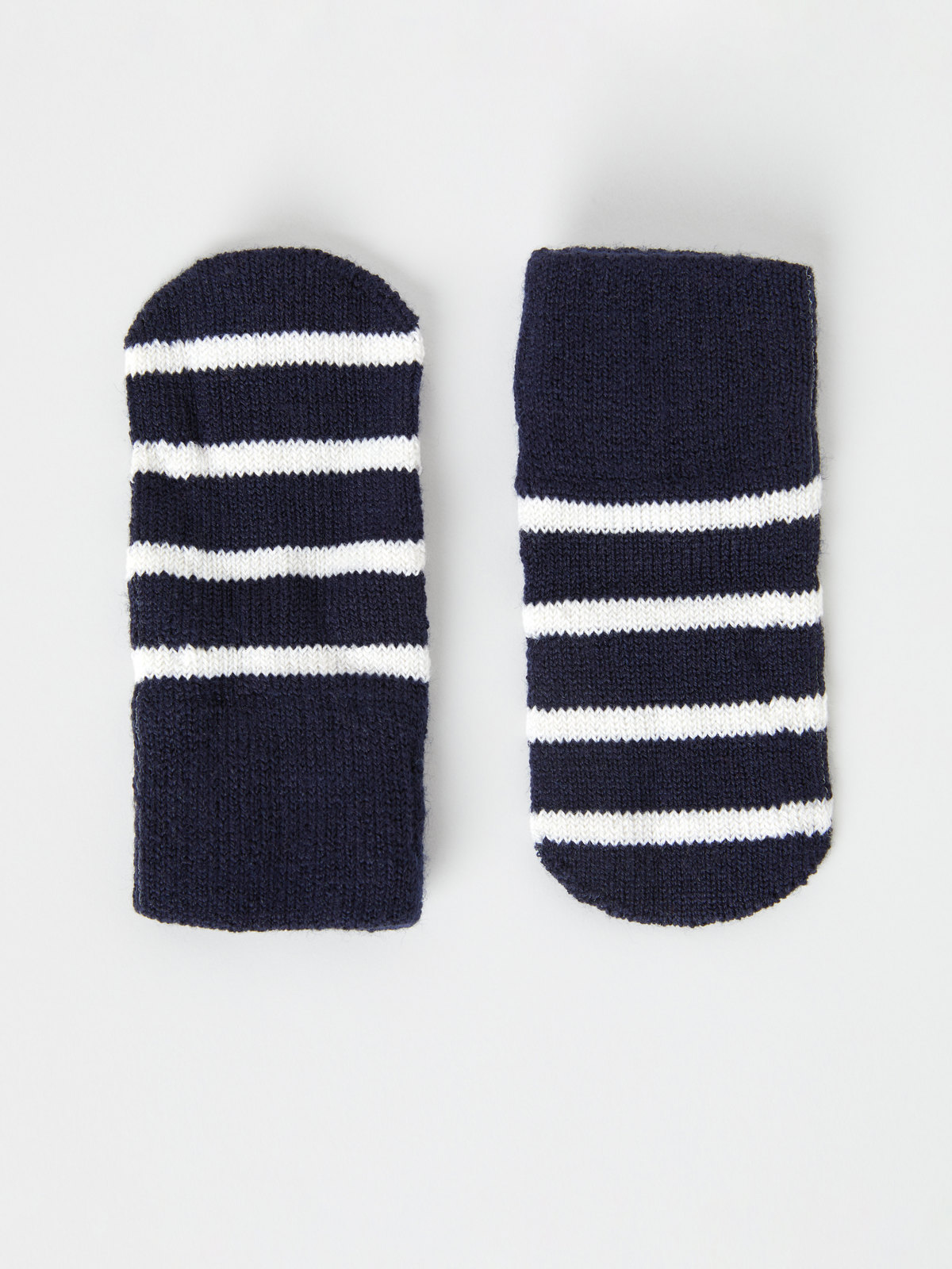Gestreifte gestrickte Fäustlinge aus Wollmix. Die Fäustlinge haben unser klassisches Streifenmuster und passen sich der Handgröße an. Größe 0 kommt ohne Daumen.