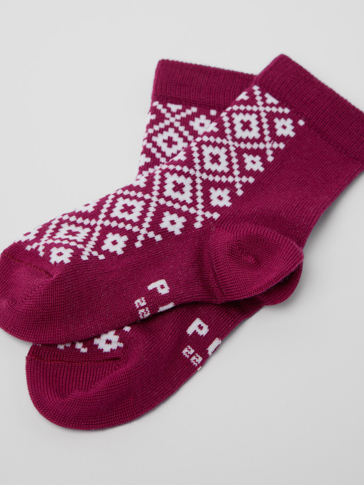 Söckchen mit Jacquardmuster aus dünner Merinowolle, die bequem an kleinen Füßen sitzen und angenehm wärmen. Die Größe ist an der Innenseite des Schafts angegeben. Dort ist auch Platz für den Namen des Kindes. Ordnung halten ist so einfach!
