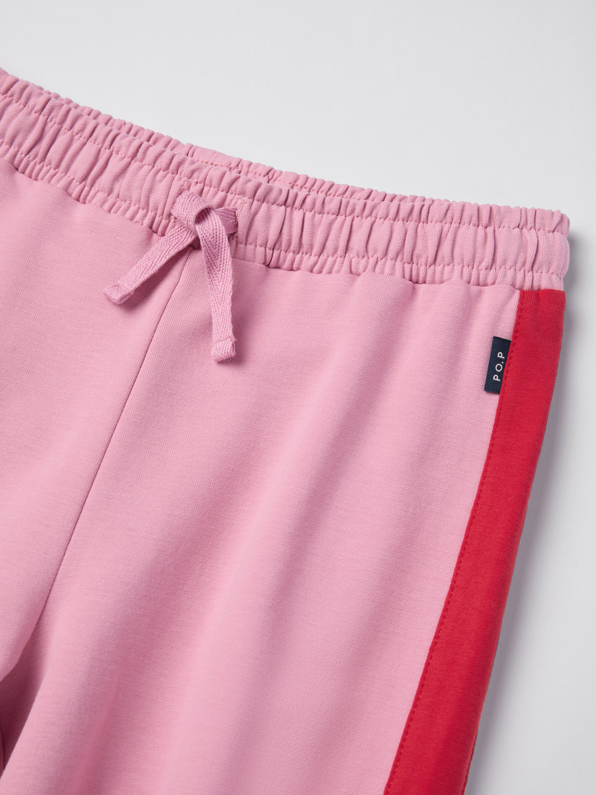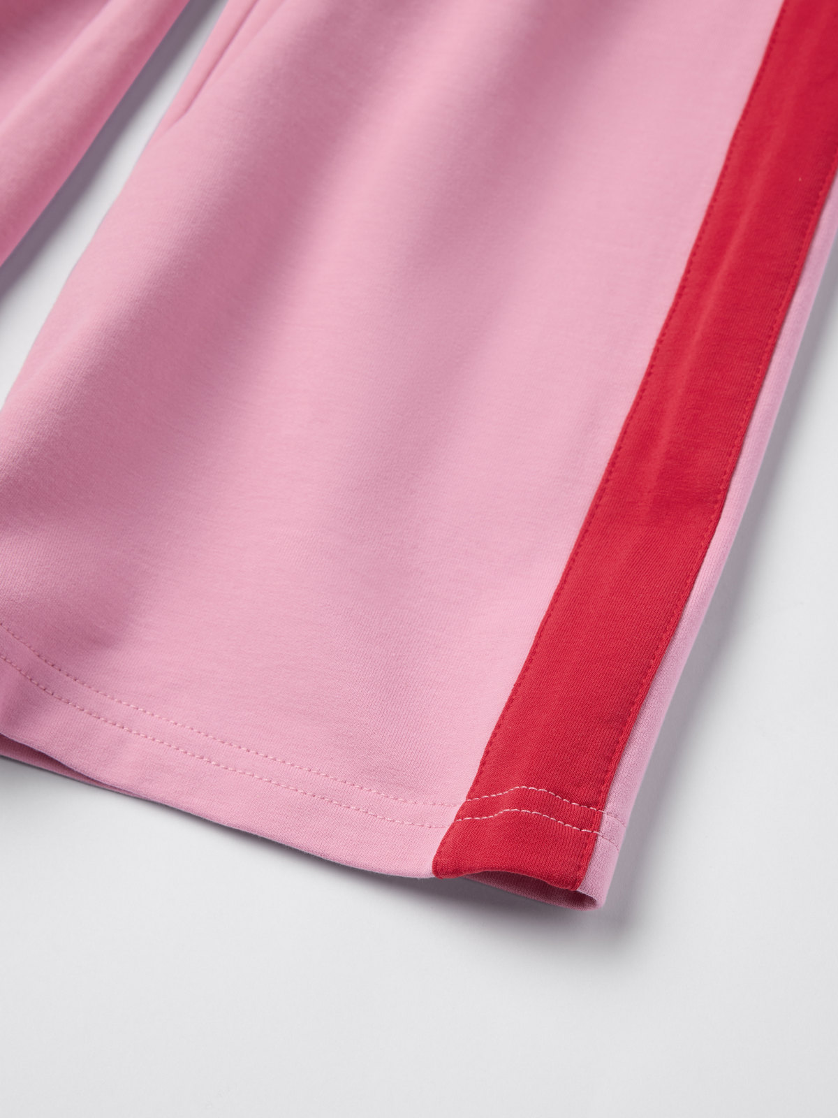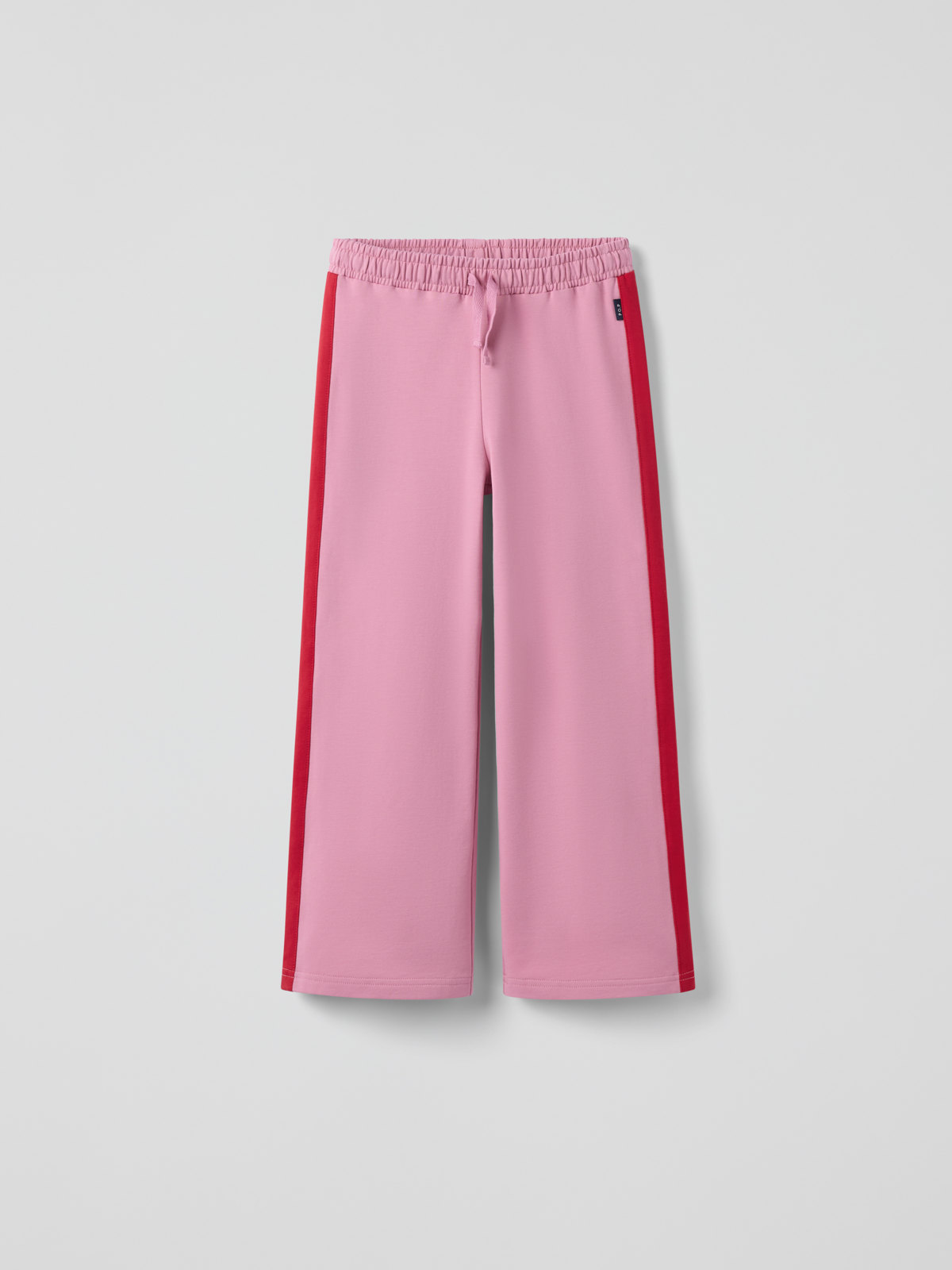Hose aus 100 % Bio-Baumwolle in weicher Sweatqualität. Die Hose hat kontrastfarbene Seitenstreifen und gerade geschnittene Beine. Der elastische Bund ist mit einem Kordelzug verstellbar.