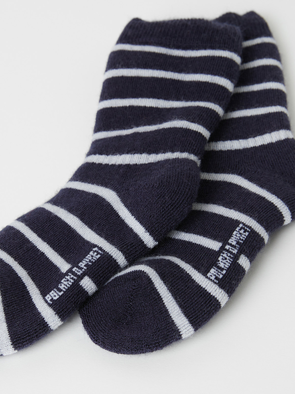 Ein Paar gestreifte Söckchen aus weichem Wollfrottee, der kleine Füße warm hält. Die Söckchen tragen unsere klassischen Streifen. Die Größe ist auf der Innenseite des Schafts angegeben. Dort ist auch Platz für den Namen des Kindes. Ordnung halten ist so einfach!