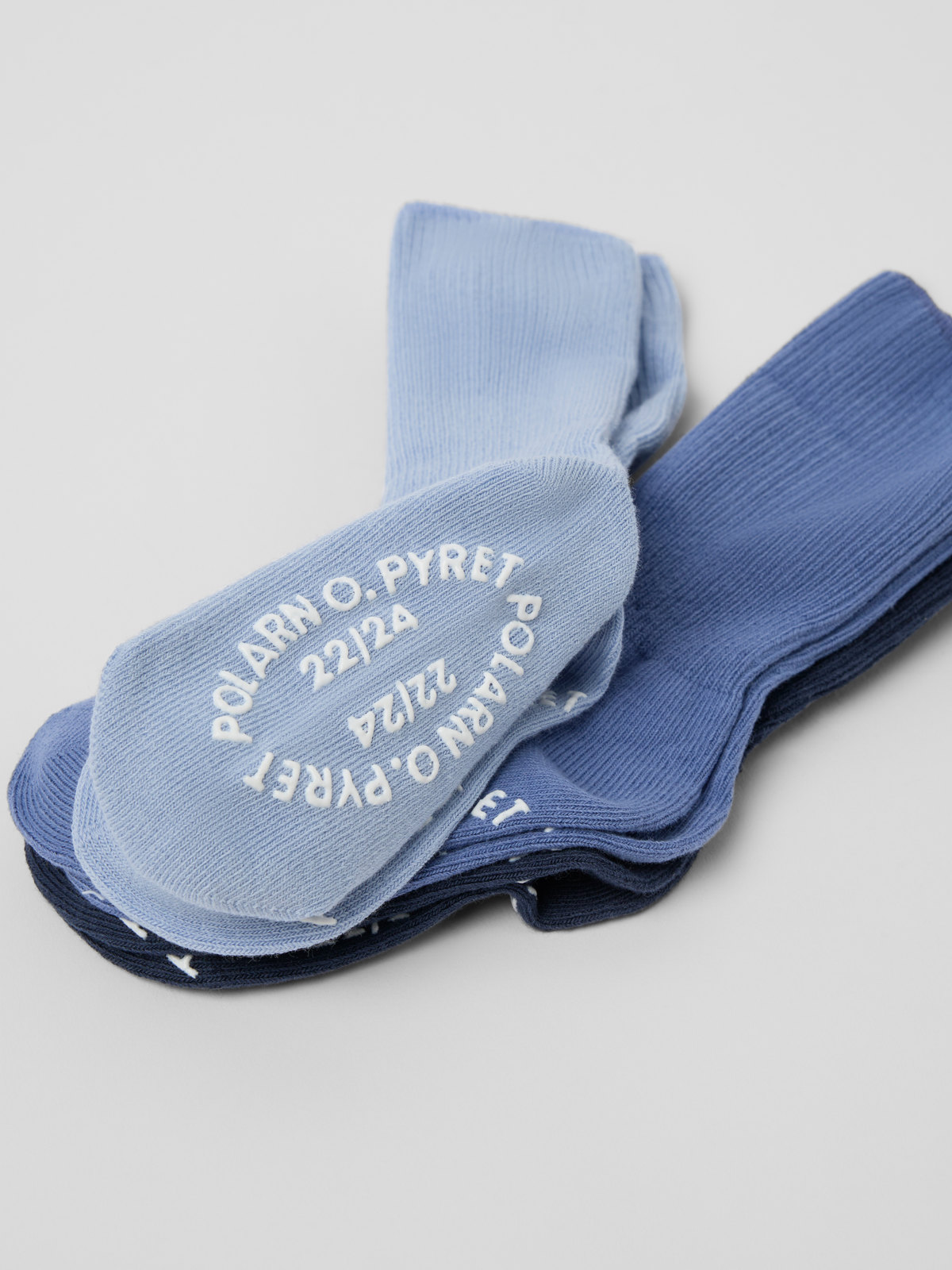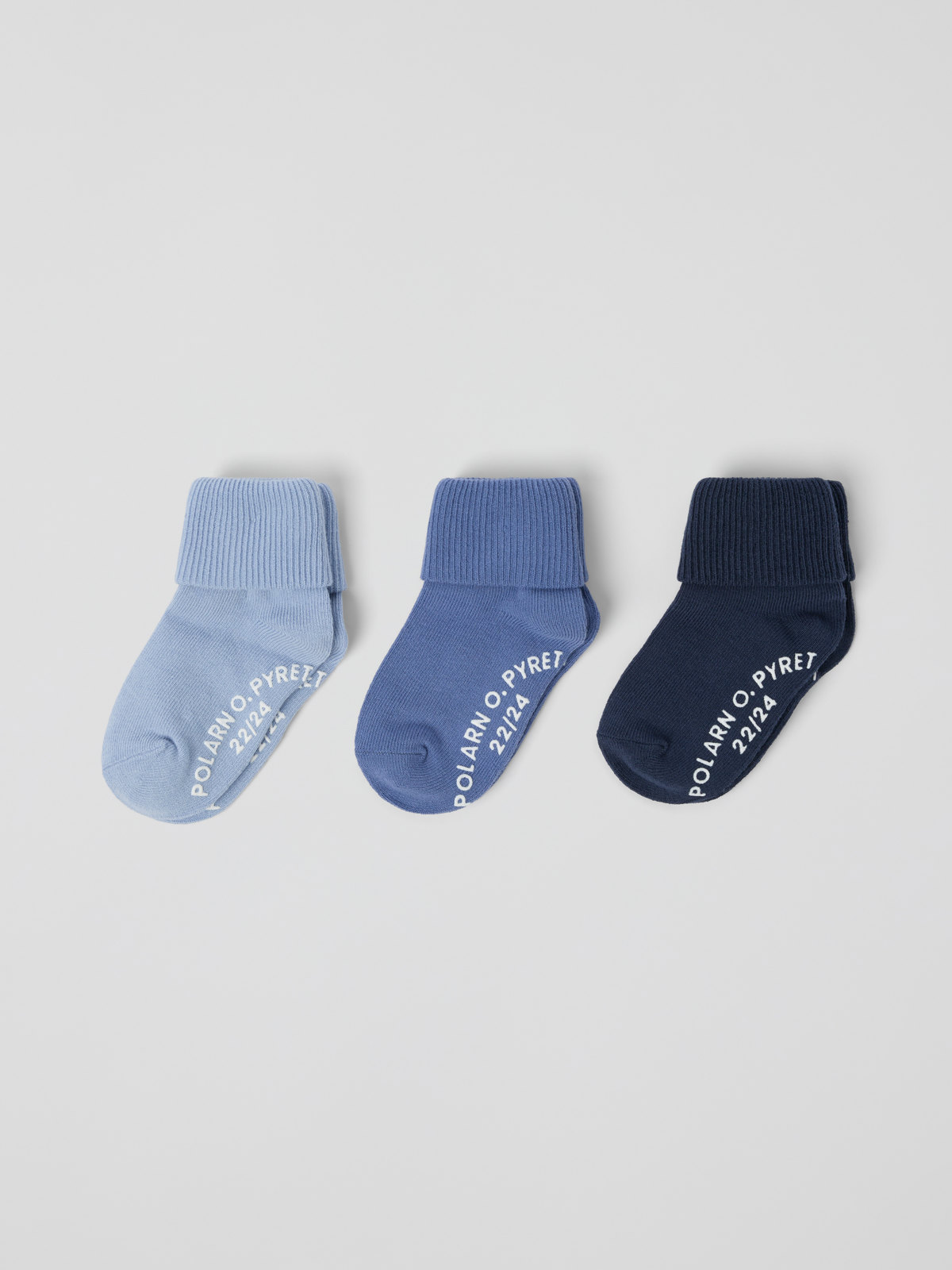 Hier kommt ein 3er-Pack Söckchen mit rutschhemmenden Noppen zum Auffüllen der Sockenschublade. Die Söckchen aus weicher Bio-Baumwolle haben Bündchen zum Umschlagen.