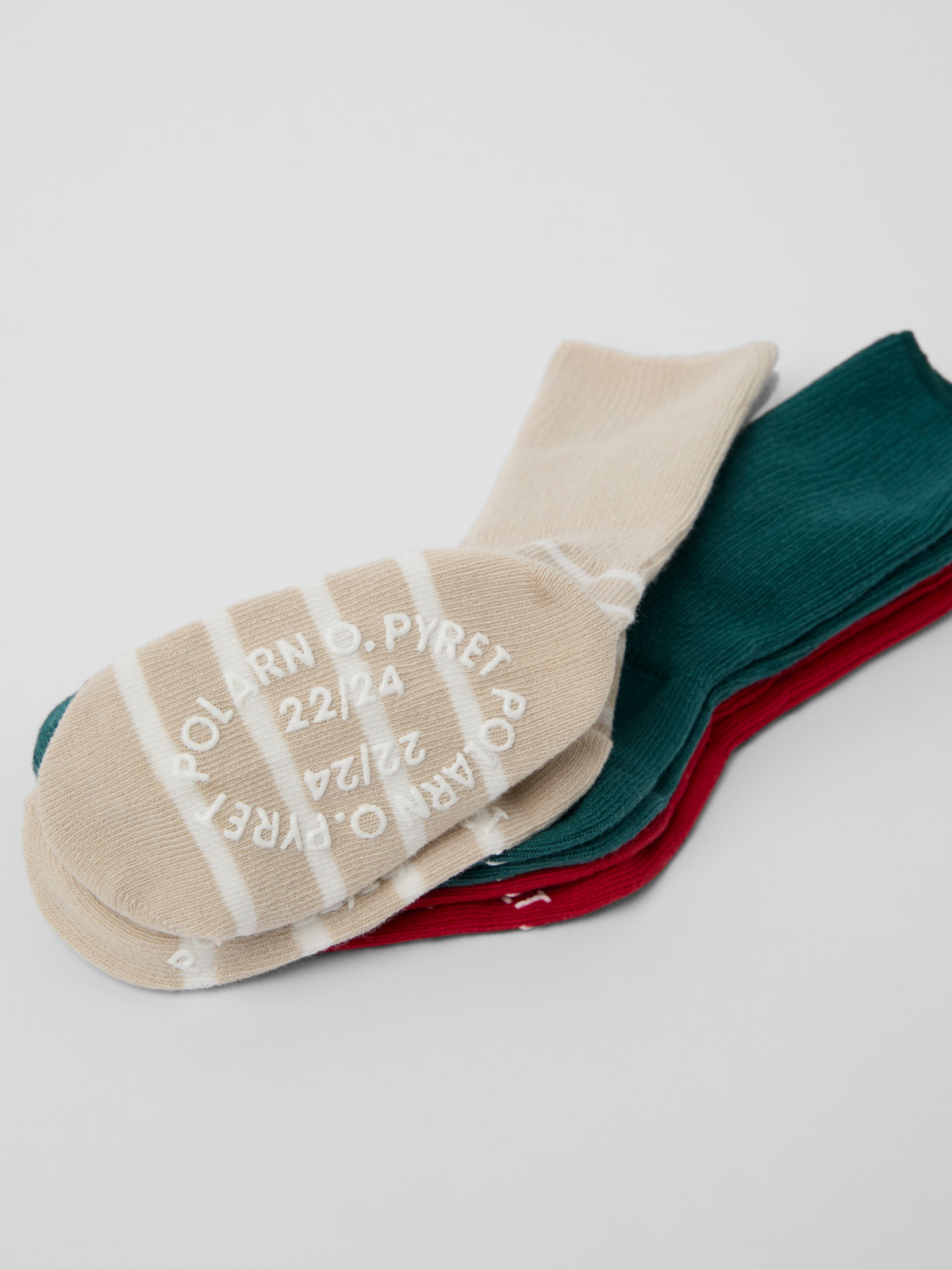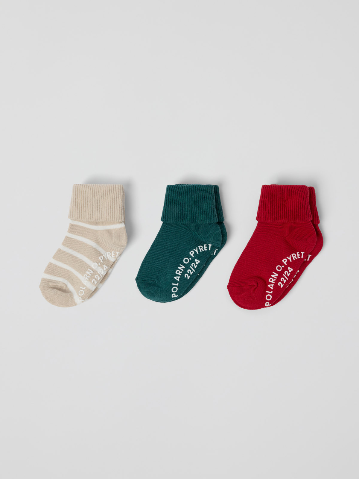 Hier kommt ein 3er-Pack Söckchen mit rutschhemmenden Noppen zum Auffüllen der Sockenschublade. Die Söckchen aus weicher Bio-Baumwolle haben Bündchen zum Umschlagen.