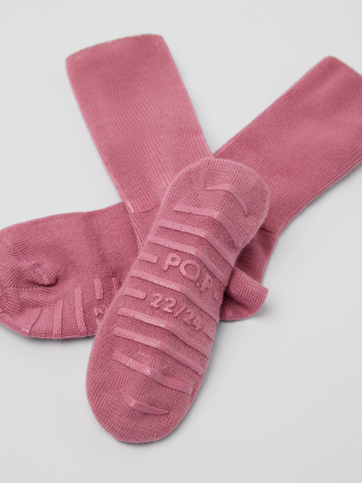 Leichte, bequeme Strümpfe aus weicher Merinowolle, die schön wärmen. Die Strümpfe haben rutschhemmende Noppen und Bündchen zum Umschlagen, damit sie auch von lebhaften Füßchen nicht herunterrutschen.