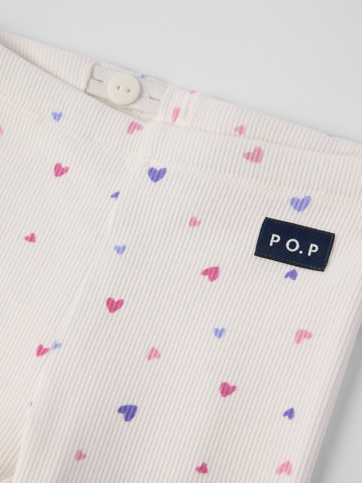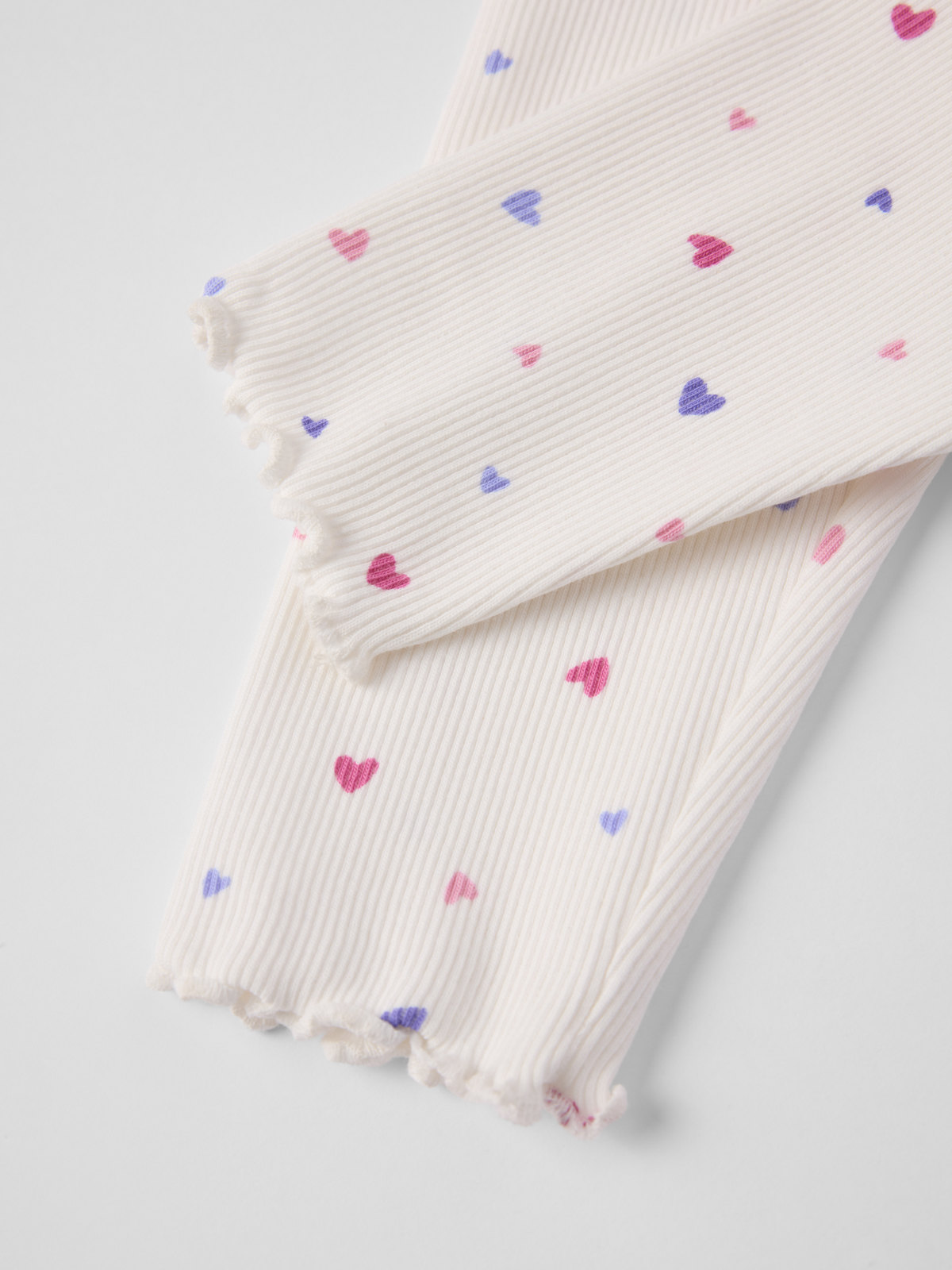 Rippenstrick-Leggings aus weicher Bio-Baumwolle für Babys. Die Leggings haben einen elastischen Bund, der mit einem Knopflochgummi reguliert werden kann, und einen Kräuselrand am Beinabschluss.