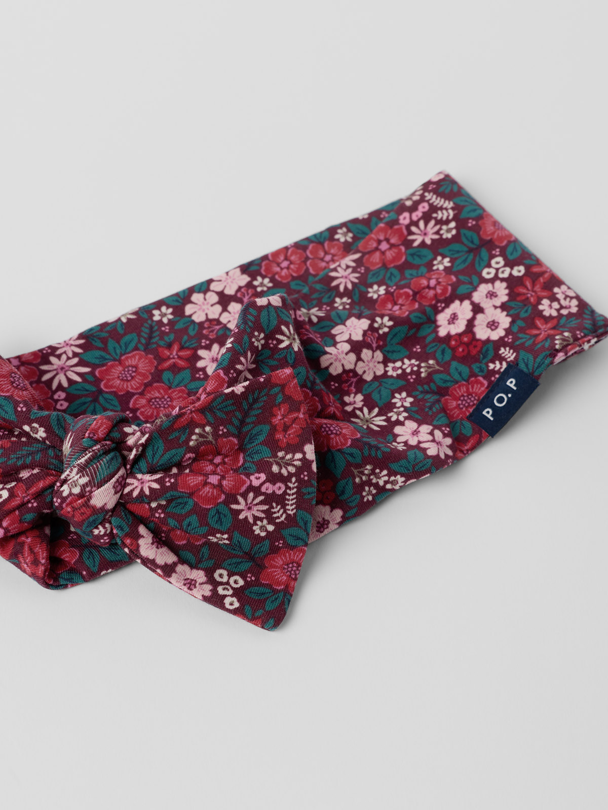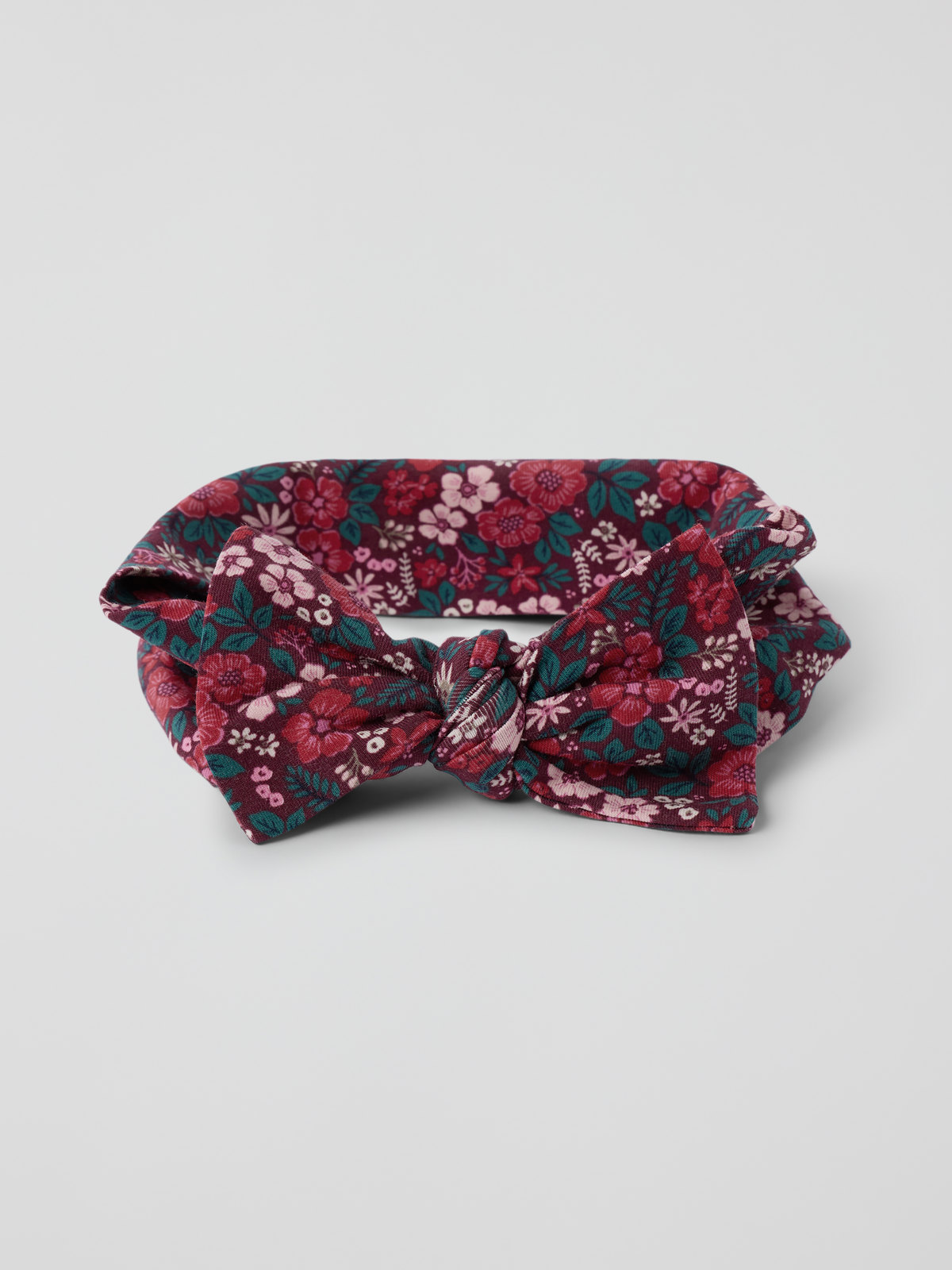 Elastisches Haarband aus weichem Baumwolltrikot. Das Haarband ist durchgehend mit Blümchen bedruckt und mit einer zauberhaften Schleife verziert.