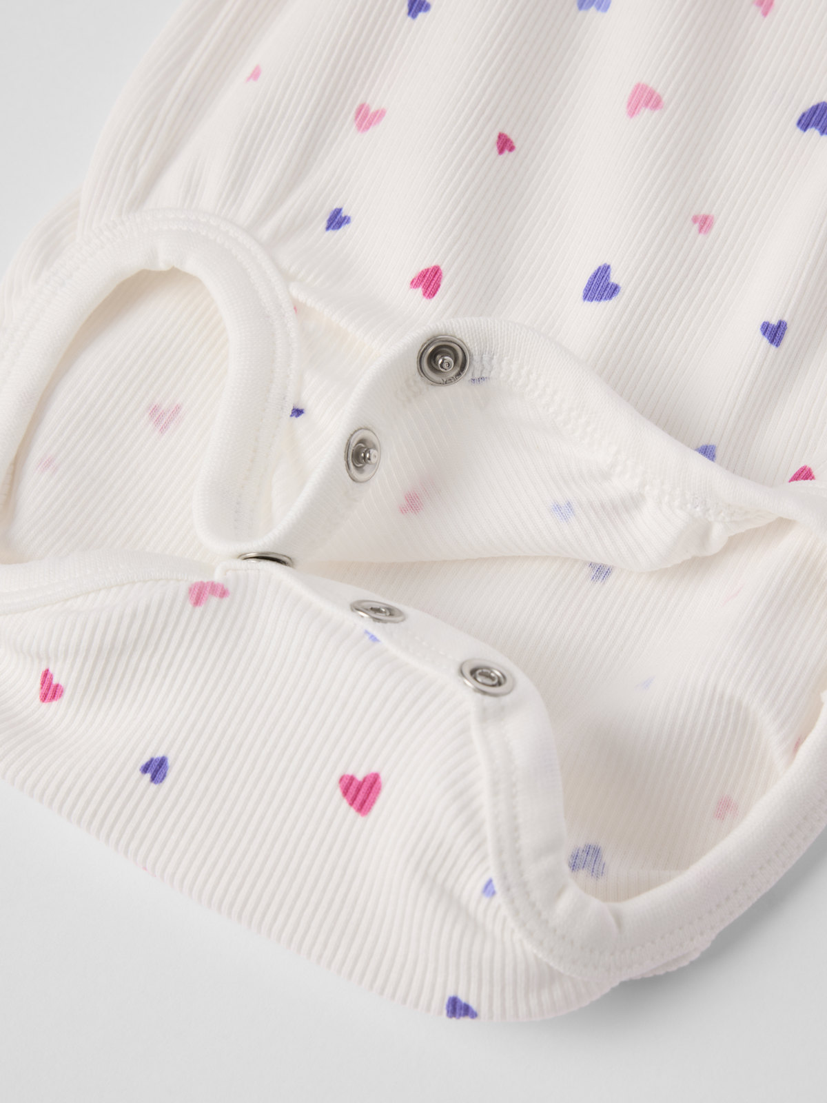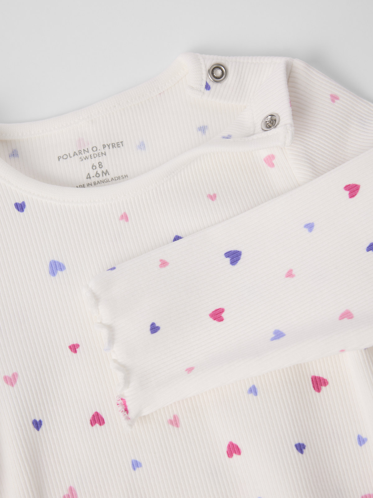 Rippenbody aus dünner Bio-Baumwolle für Babys. Der Body hat besonders weiche, flache Nähte, die sanft zu empfindlicher Haut sind und hat einen süßen gewellten Abschluss an den Ärmeln. Druckknöpfe an der einen Schulter und im Schritt erleichtern das An- und Ausziehen.