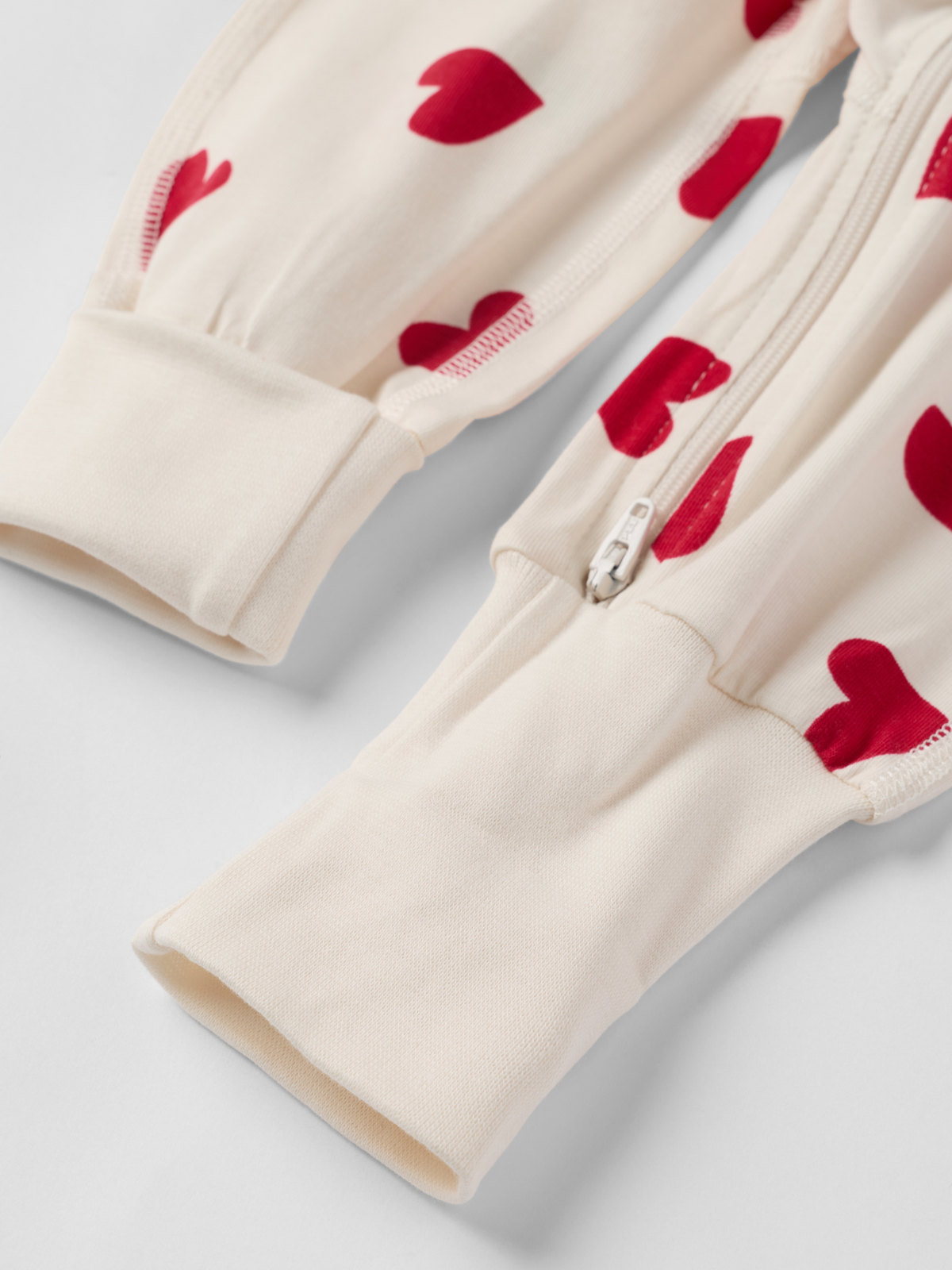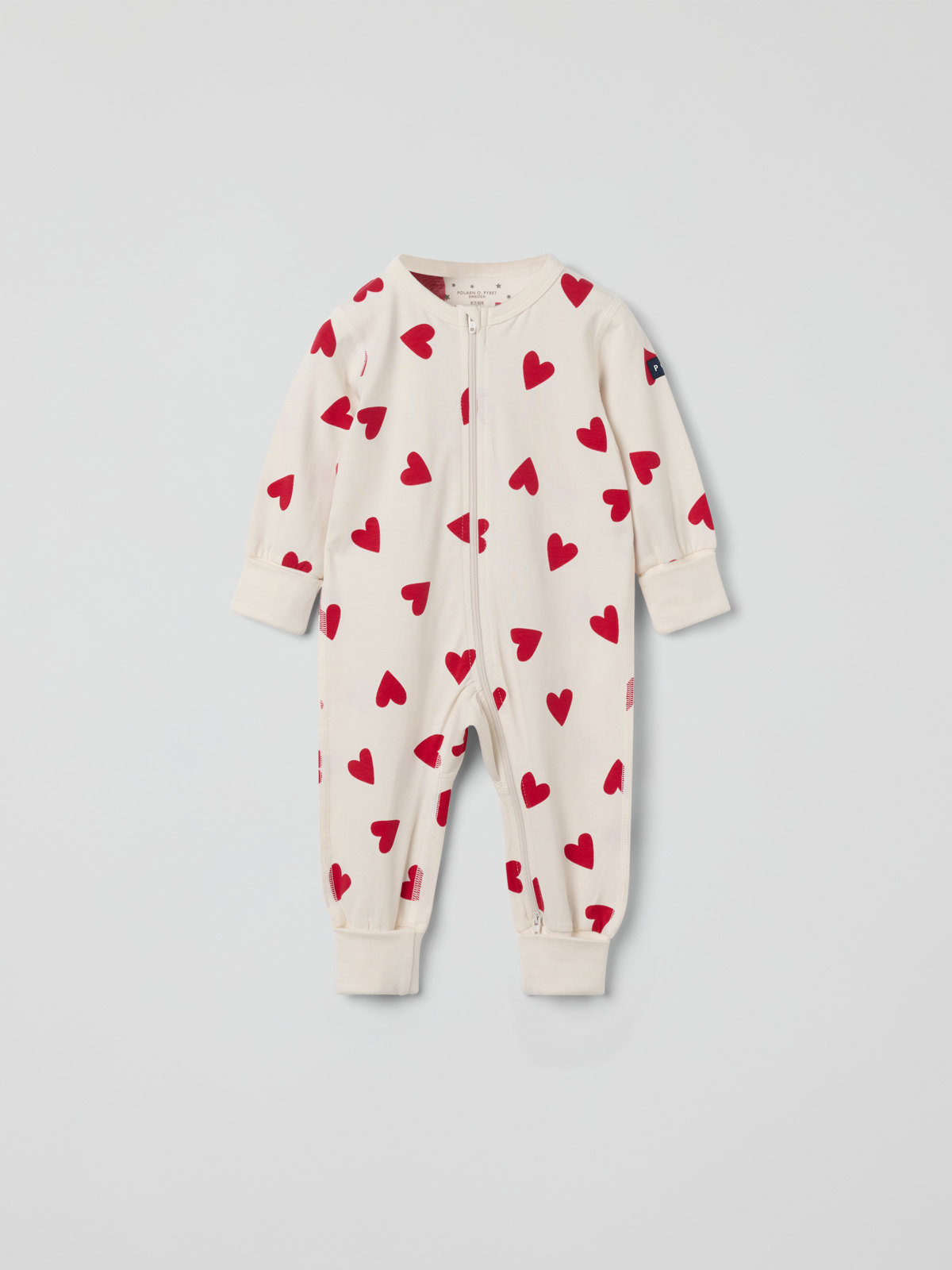 Schlafoverall aus weicher Bio-Baumwolle mit besonders weichen, flachen Nähten, die sanft zu empfindlicher Haut sind. Die extra langen Bündchen an Ärmel- und Beinabschlüssen können umgeschlagen werden, dadurch wächst das Kleidungsstück etwas mit deinem Kind mit. Der lange Reißverschluss reicht vom Hals bis zum Beinabschluss und kann von oben und unten geöffnet werden; das ist praktisch beim An- und Ausziehen.