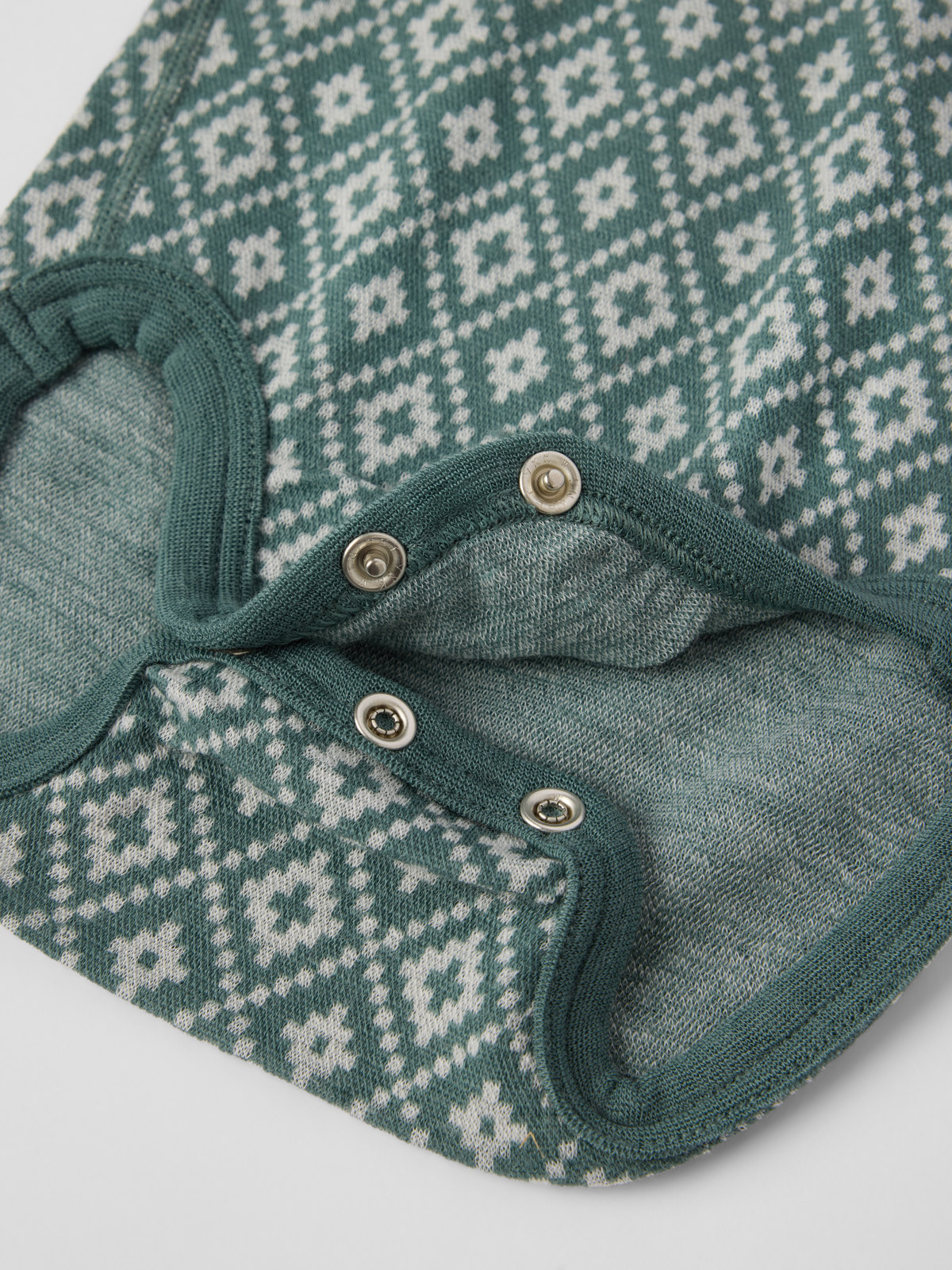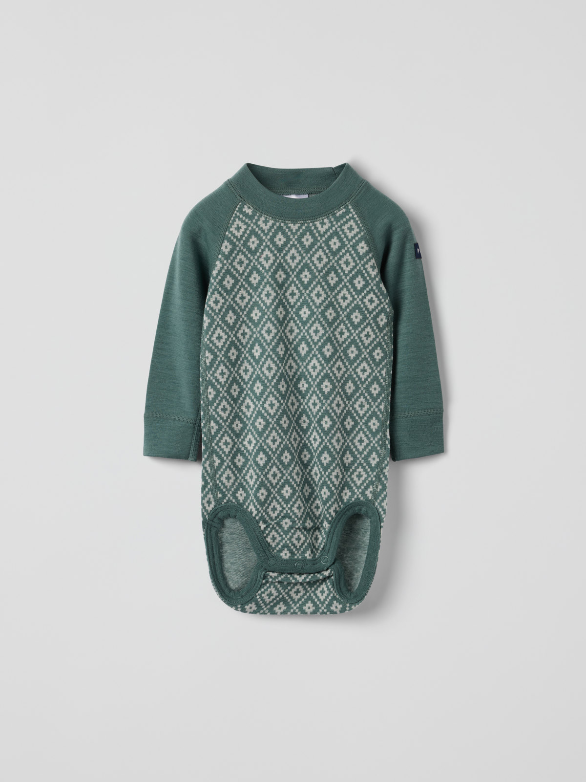 Langärmeliger Jacquard-Body aus wärmender Merinowolle für Babys – perfekt als erste Schicht unter dem Winteroverall! Merinowolle hält auch im feuchten Zustand warm und hilft, die Körpertemperatur zu regulieren. Sie ist zudem unschlagbar weich auf der Haut. Der Body ist mit besonders weichen Nähten gefertigt, die nicht reiben, und verfügt über Druckknöpfe im Schritt für einfaches An- und Ausziehen sowie Windelwechseln.