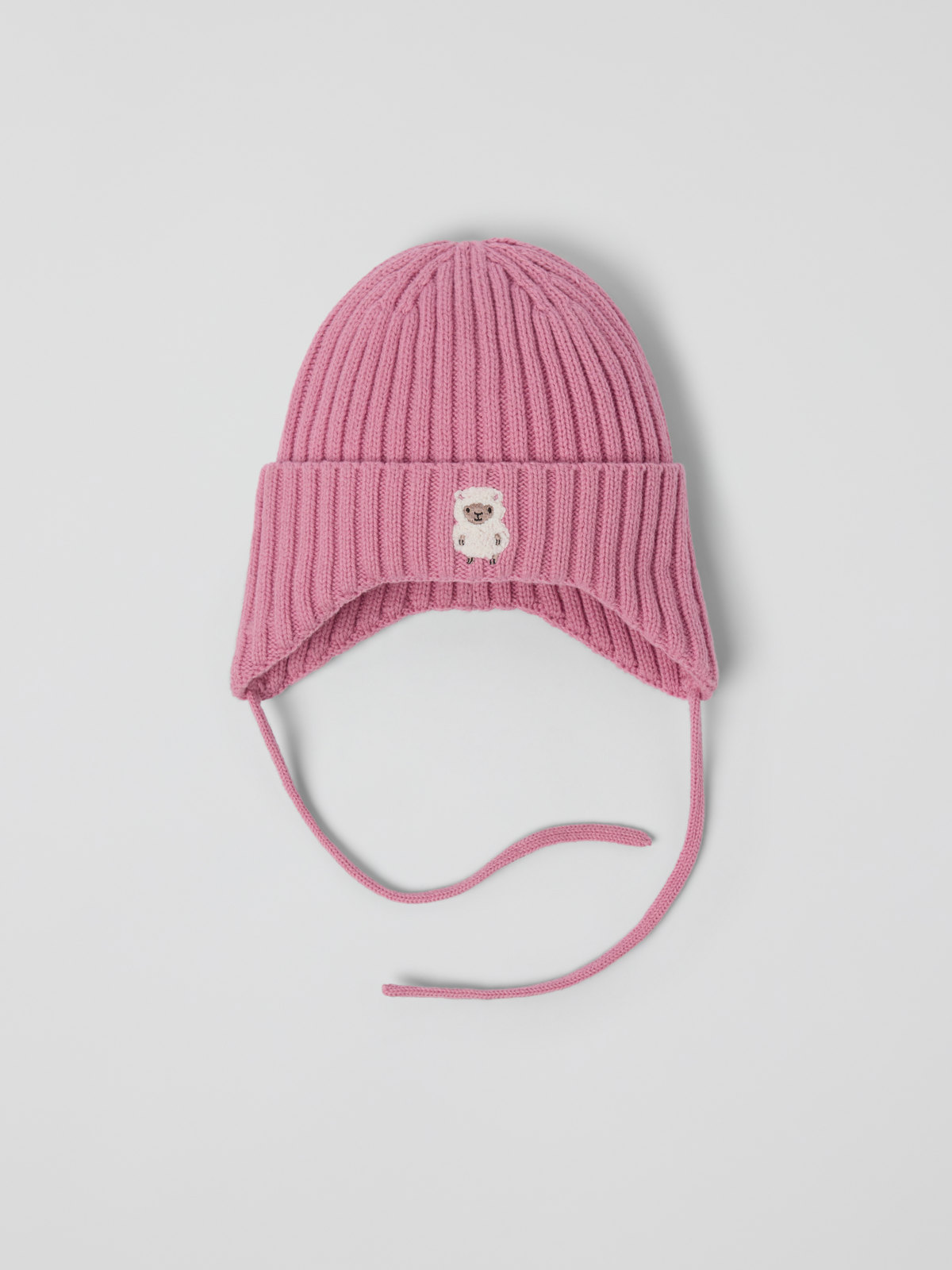 Gerippte Mütze aus einer weichen und warmen Mischung aus Wolle und Baumwolle. Die Mütze hat ein Umschlagbündchen mit einer süßen kleinen Applikation vorne in der Mitte und reicht etwas weiter über die Ohren – für zusätzliche Wärme und eine bequeme Passform. Sie wird mit Bindebändern sicher am Platz gehalten.