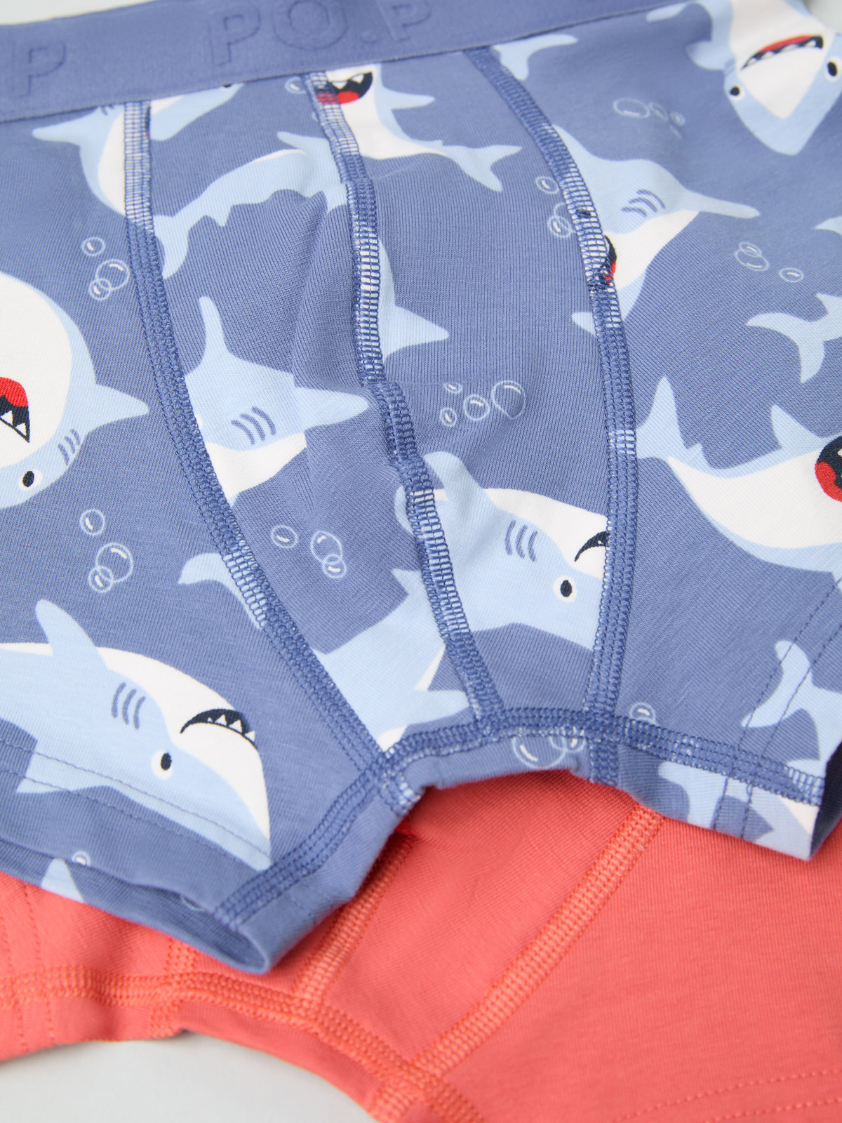 2er-Pack Boxershorts aus Bio-Baumwolle, bei denen dank besonders weicher Nähte nichts scheuert. Das eine Höschen ist durchgehend mit Walen gemustert, das andere ist einfarbig.