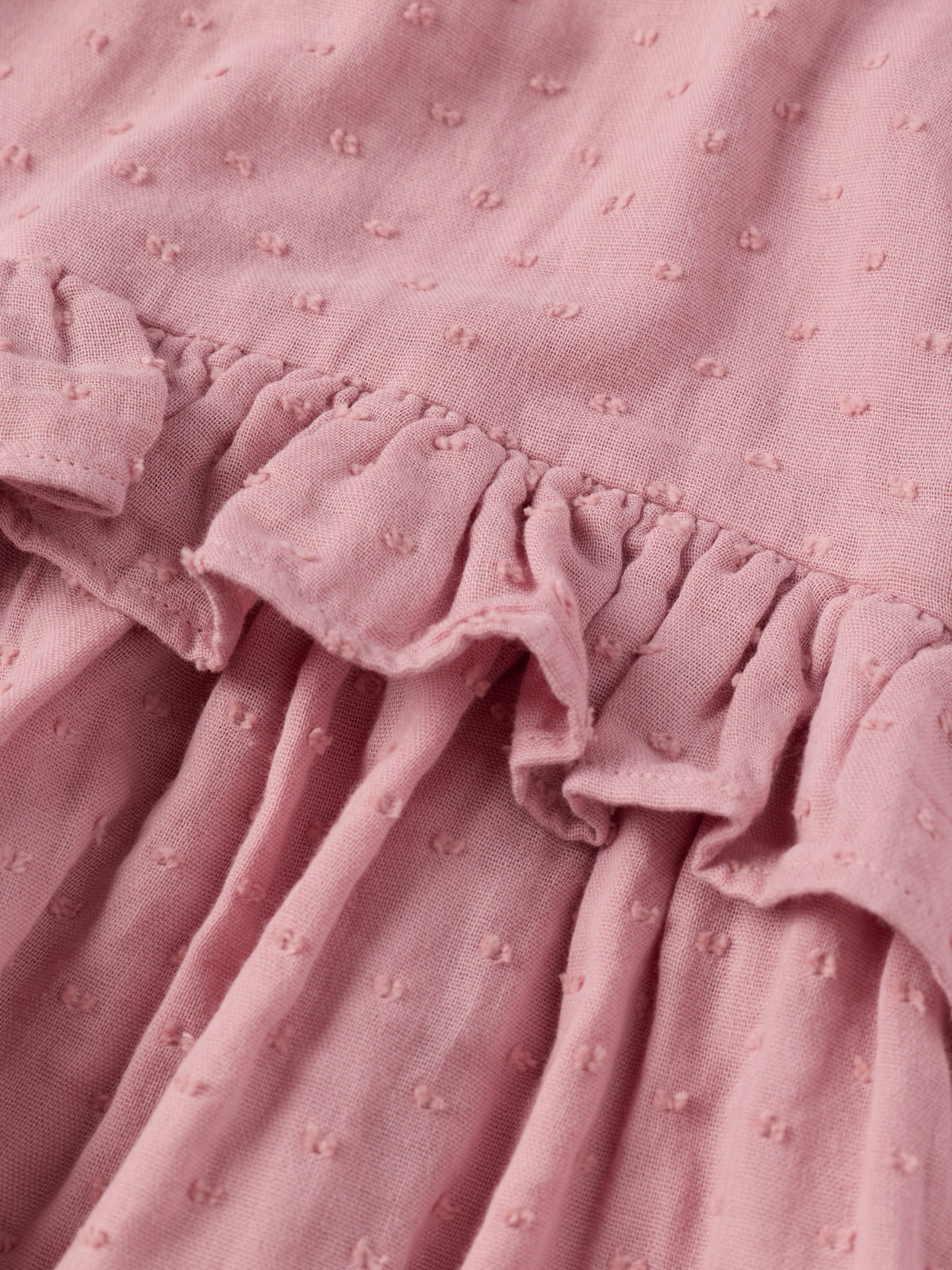 Süßes Musslinkleid aus 100 % Bio-Baumwolle für Babys – perfekt für jeden Anlass! Das Kleid ist mit Volants an der Taille und an den Schultern verziert und wird hinten mit einer Knopfleiste geschlossen. Die Ärmel haben elastische Abschlüsse.