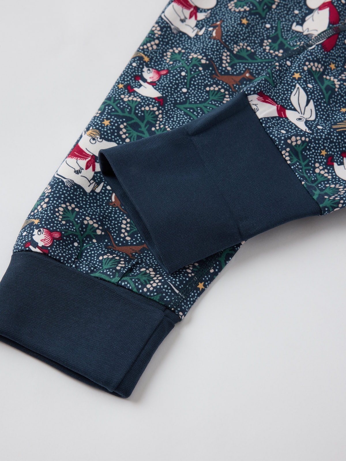 Zweiteiliger Schlafanzug aus weicher Bio-Baumwolle – Teil unserer beliebten Design-Kooperation zur Feier des 80. Mumin-Jubiläums 2025. Der Schlafanzug ist rundum bedruckt mit Illustrationen aus Tove Janssons Mumintroll-Geschichten. Das Oberteil hat extra lange Ärmelbündchen, die hoch- oder runtergeklappt werden können. Die Hose hat einen elastischen Bund und extra lange Beinabschlüsse.